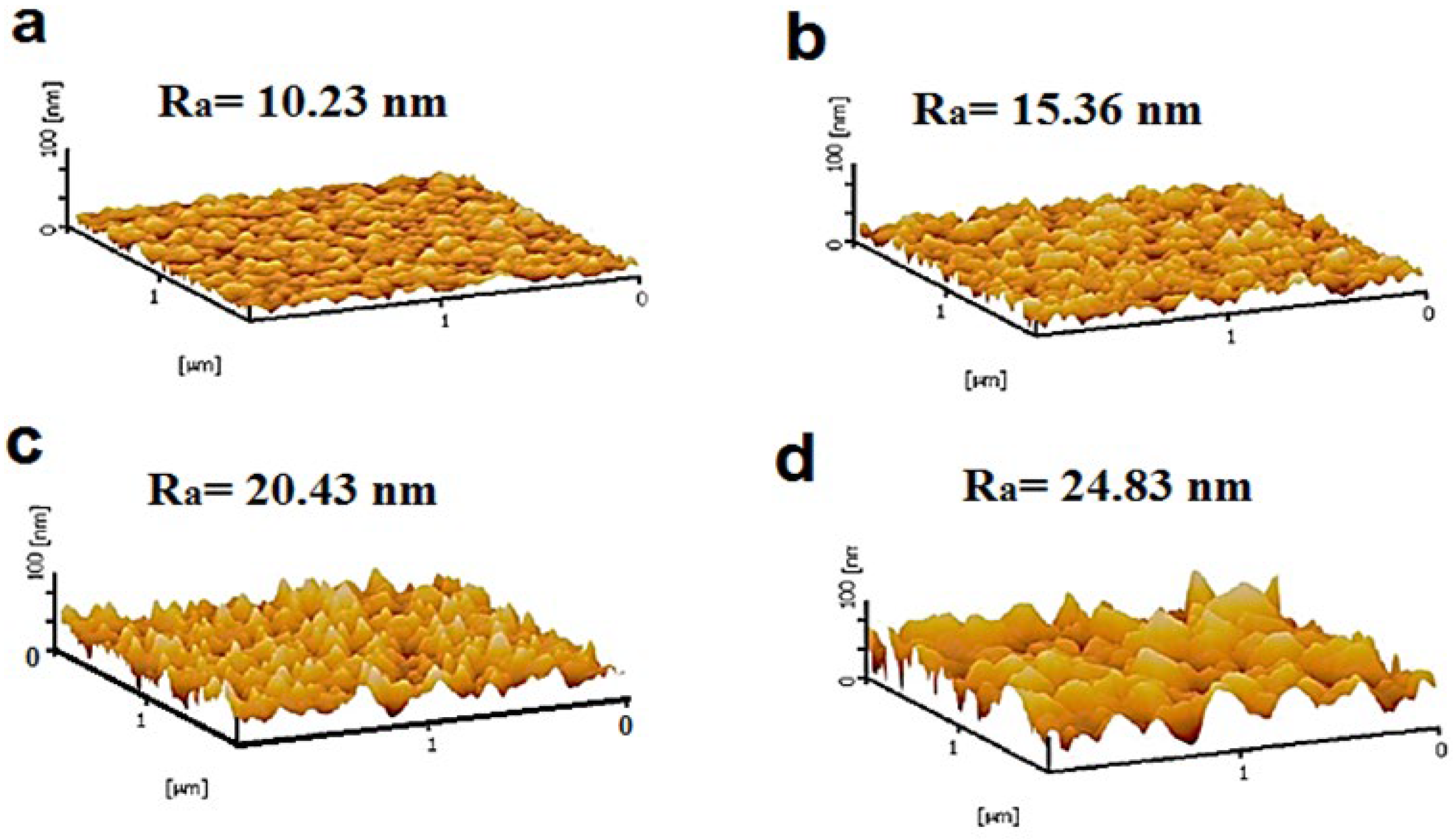 AFM was employed to characterize the surface topography of the fabricated membranes. The 3D AFM images of the developed membranes are presented in Figure 7, along with their corresponding average surface roughness (Ra) values. The results indicate that the incorporation of NiMOF@MGO increases the surface roughness of the MMMs compared to the pristine PSF membrane. Specifically, the PMM-0.2 membrane exhibits the highest Ra value of 24.83 nm. The observed increase in surface roughness correlates with the higher weight percentages of NiMOF@MGO in the polymer solutions used for membrane fabrication, which also increases the solution viscosity and the casting shear rate, both of which influence the membrane surface morphology. Higher-viscosity polymer solutions promote the formation of finer and more uniform pores, resulting in a rougher surface. This enhanced roughness contributes to increased membrane hydrophilicity and improved resistance to surface fouling [47,48].