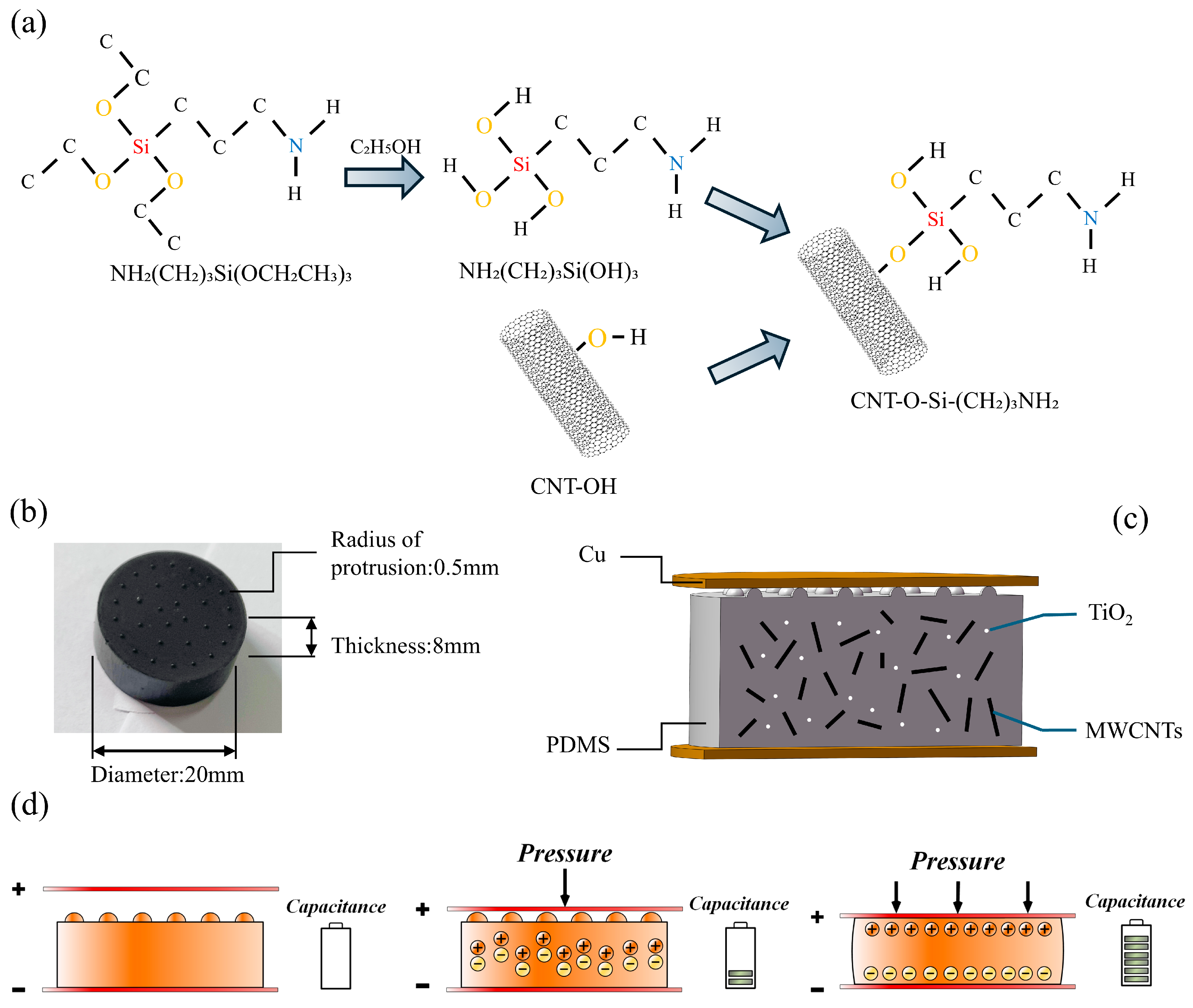 Highly Sensitive Capacitive Pressure Sensor Based on MWCNTs/TiO2/PDMS with a Microhemispherical Array and APTES-Modified Interface