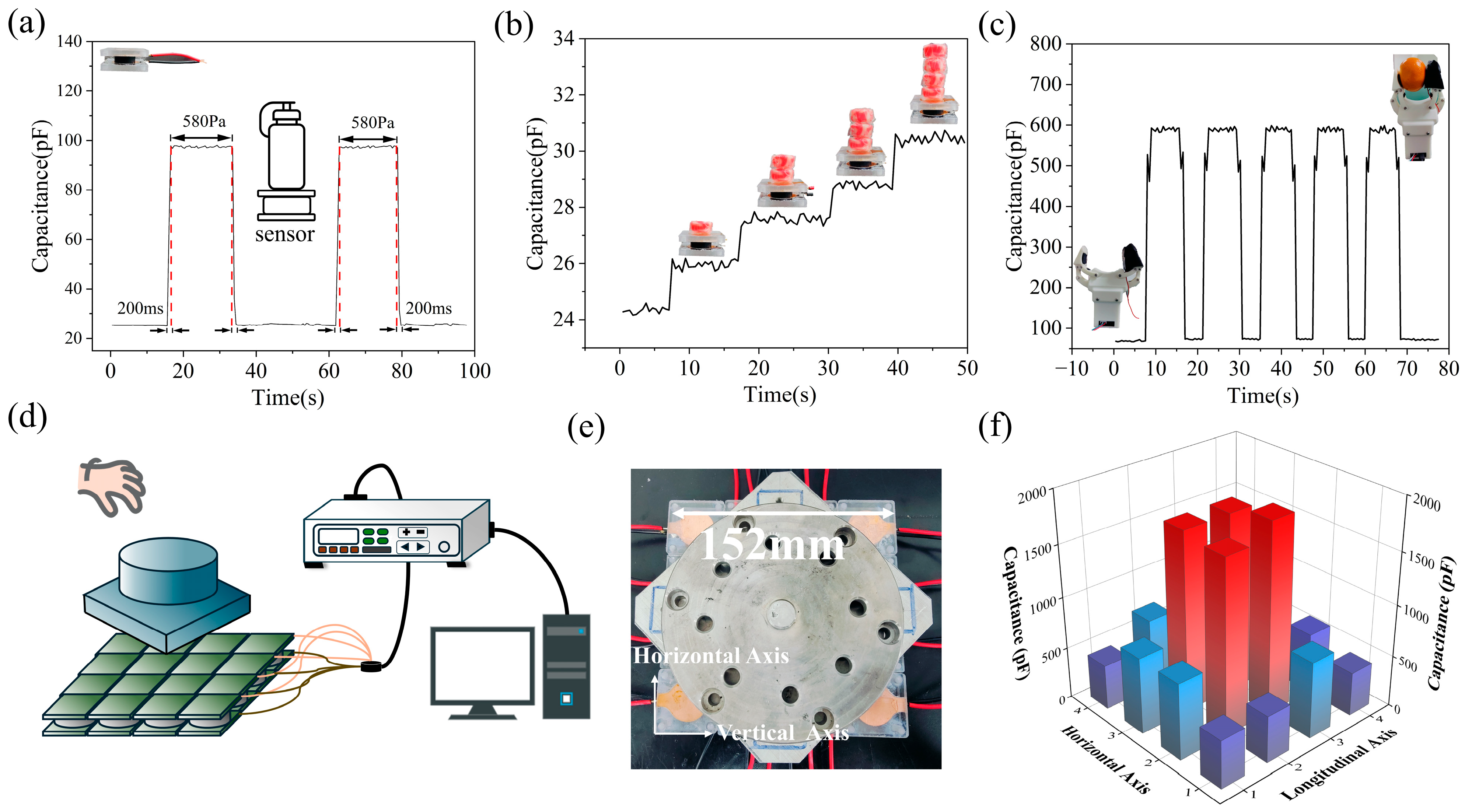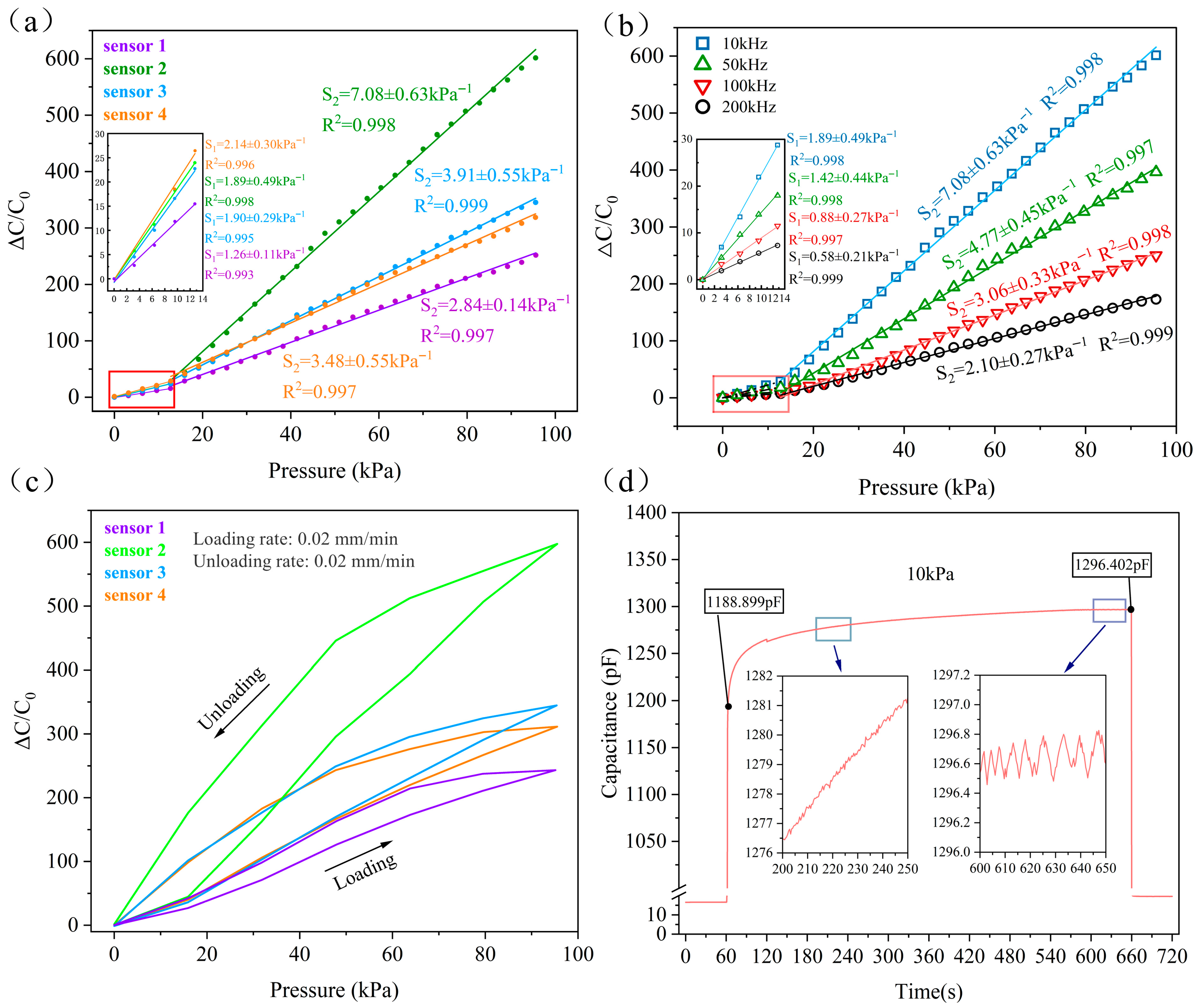 | Initial Capacitance (pF) | Max Capacitance (pF) | Sensitivity (kPa−1) | R2 Values | Hysteresis (%) | |