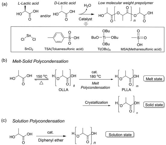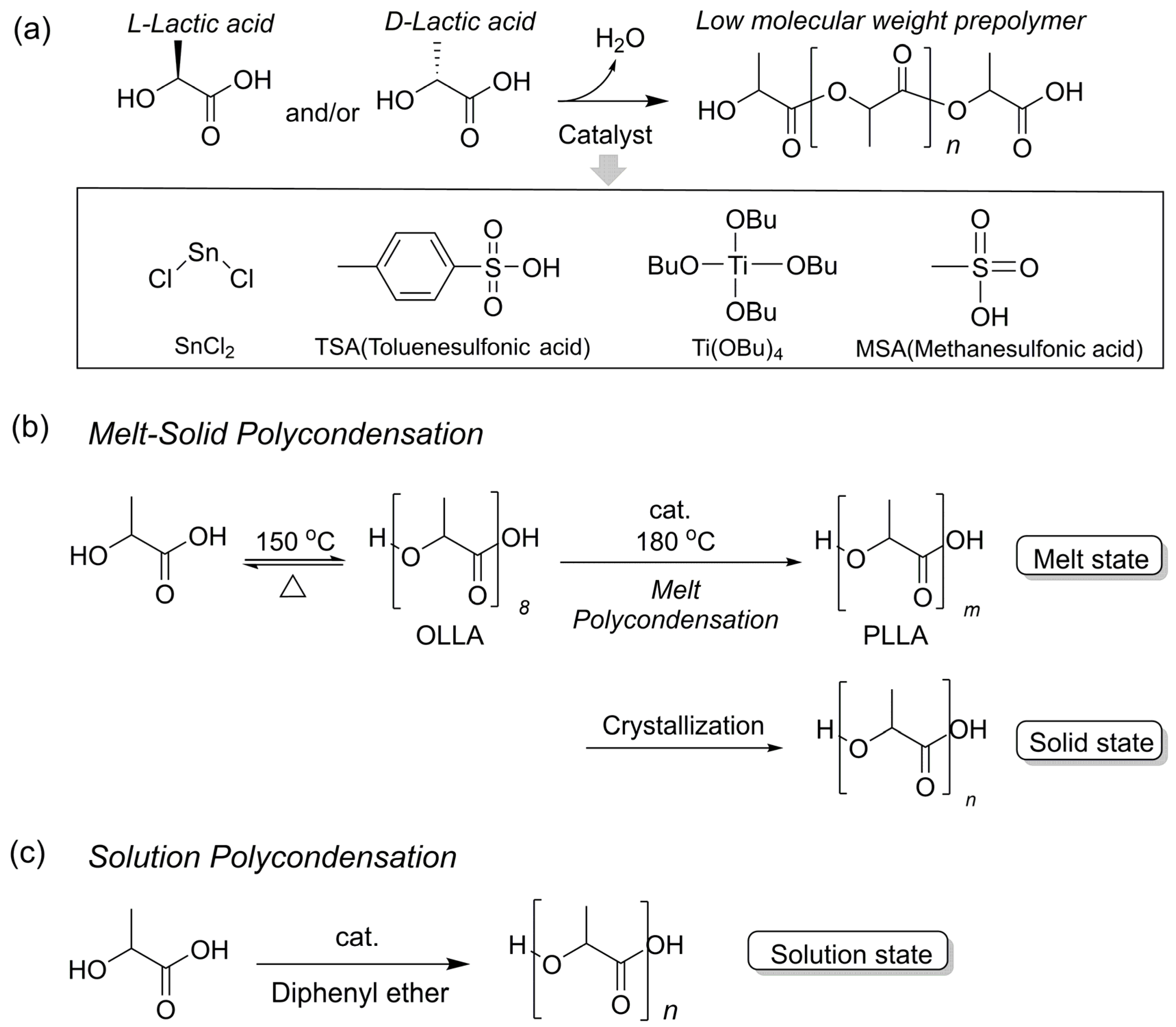- Moon, S.I.; Lee, C.W.; Miyamoto, M.; Kimura, Y. Melt polycondensation of L-lactic acid with Sn(II) catalysts activated by various proton acids: A direct manufacturing route to high molecular weight Poly(L-lactic acid). J. Polym. Sci. Part A Polym. Chem. 2000, 38, 1673–1679. [Google Scholar] [CrossRef]