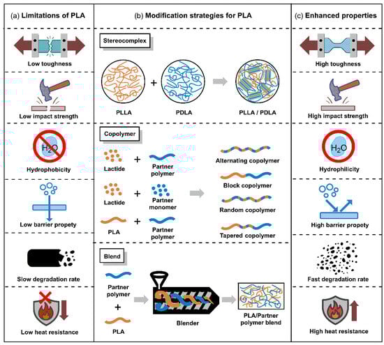 | Modification Strategy | Toughness | Heat Resistance | Barrier Properties | Biodegradability | Processability | Key Trade-Offs | References |