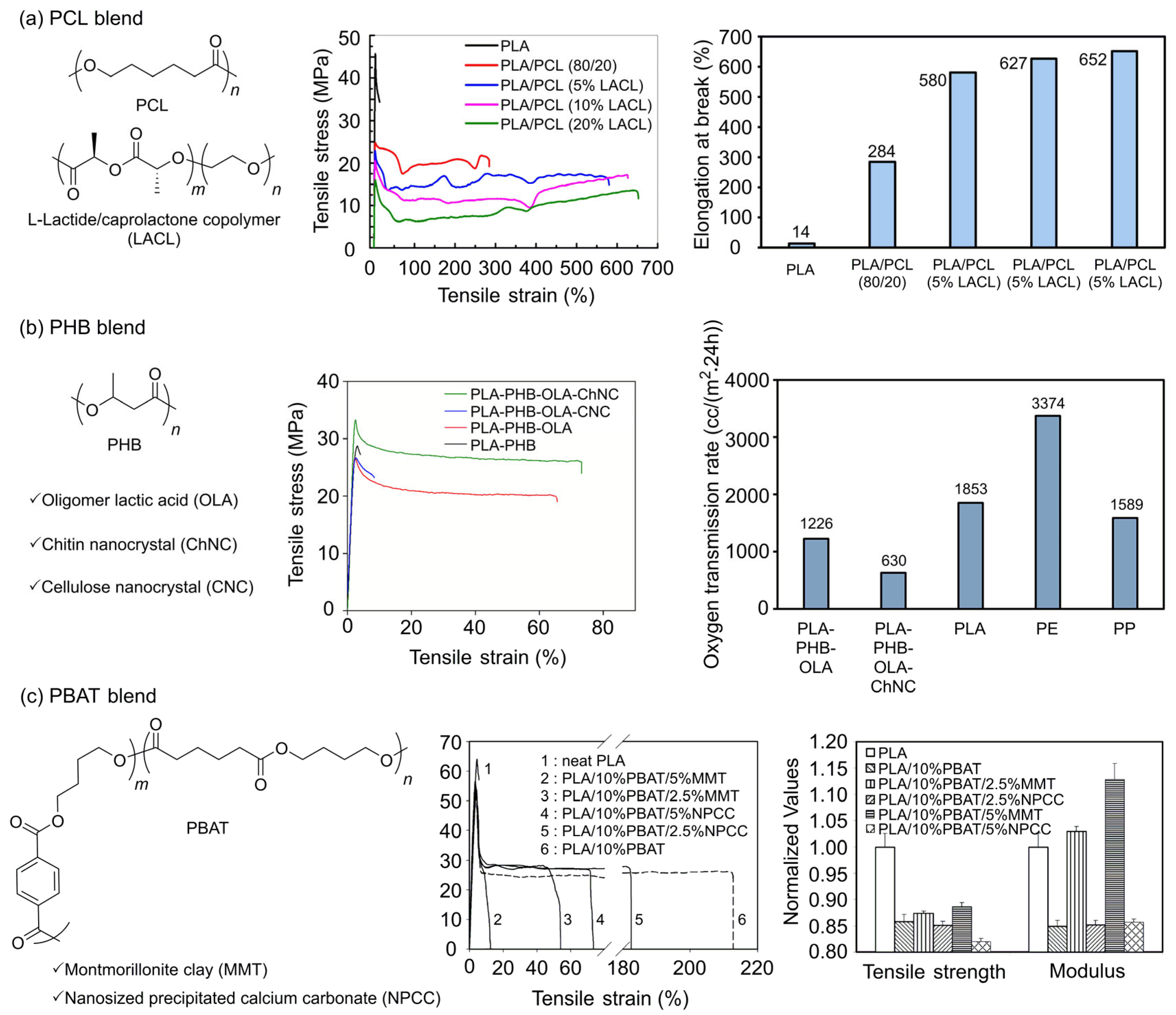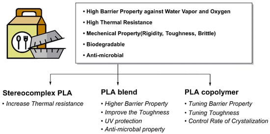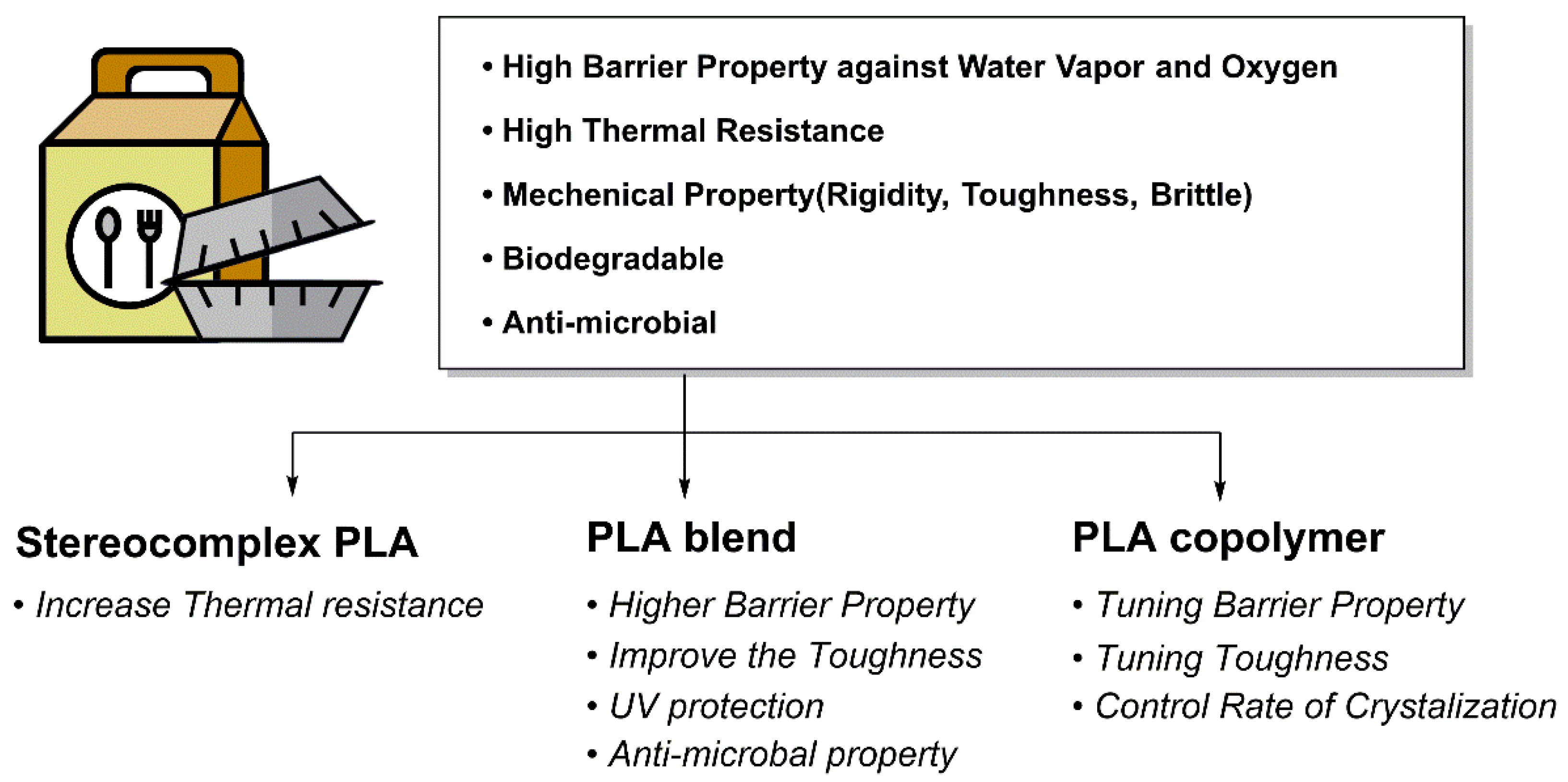 | Food packaging | Gas and Water barrier properties, Thermal Resistance, Toughness, Biodegradable | ScPLA, Blend (TPS, PHB, PBAT) Copolymer (PCL, PEG, PGA, PBS) | [133,137,164,165,166,167,168,169,170,171,172,173,174,175,176,177,178,179,180] |