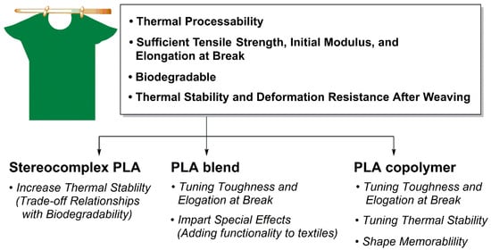 | Fiber and textile | Processability, Toughness, Biodegradable, Thermal Stability | ScPLA, Blend (cotton, cellulose-based fibers) Copolymer (PCL, PGA) | [161,181,182,183,184,185,186,187] |