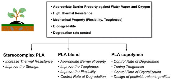 | Agriculture | Thermal Resistance, Toughness, Controlled degradation | ScPLA, Blend (PBAT, PBS, PCL, PHA, PBS) Copolymer (PCL, PGA, succinate, trimethylene carbonate) | [12,89,113,115,188,189,190,191,192,193,194,195,196,197,198] |
