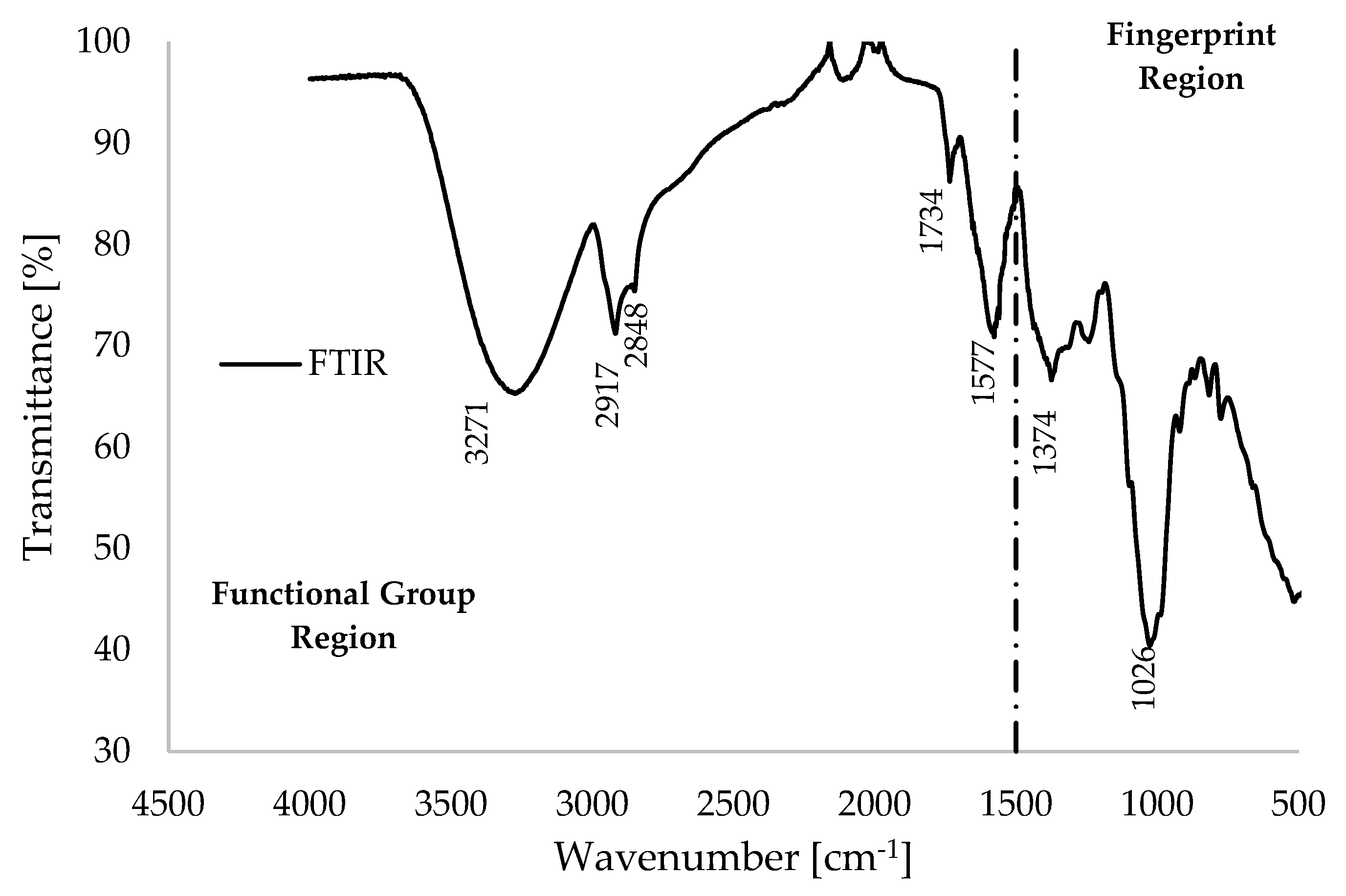 - InstaNANO. FTIR Functional Group Database Table with Search. Available online: https://instanano.com/all/characterization/ftir/ftir-functional-group-search/ (accessed on 22 May 2025).