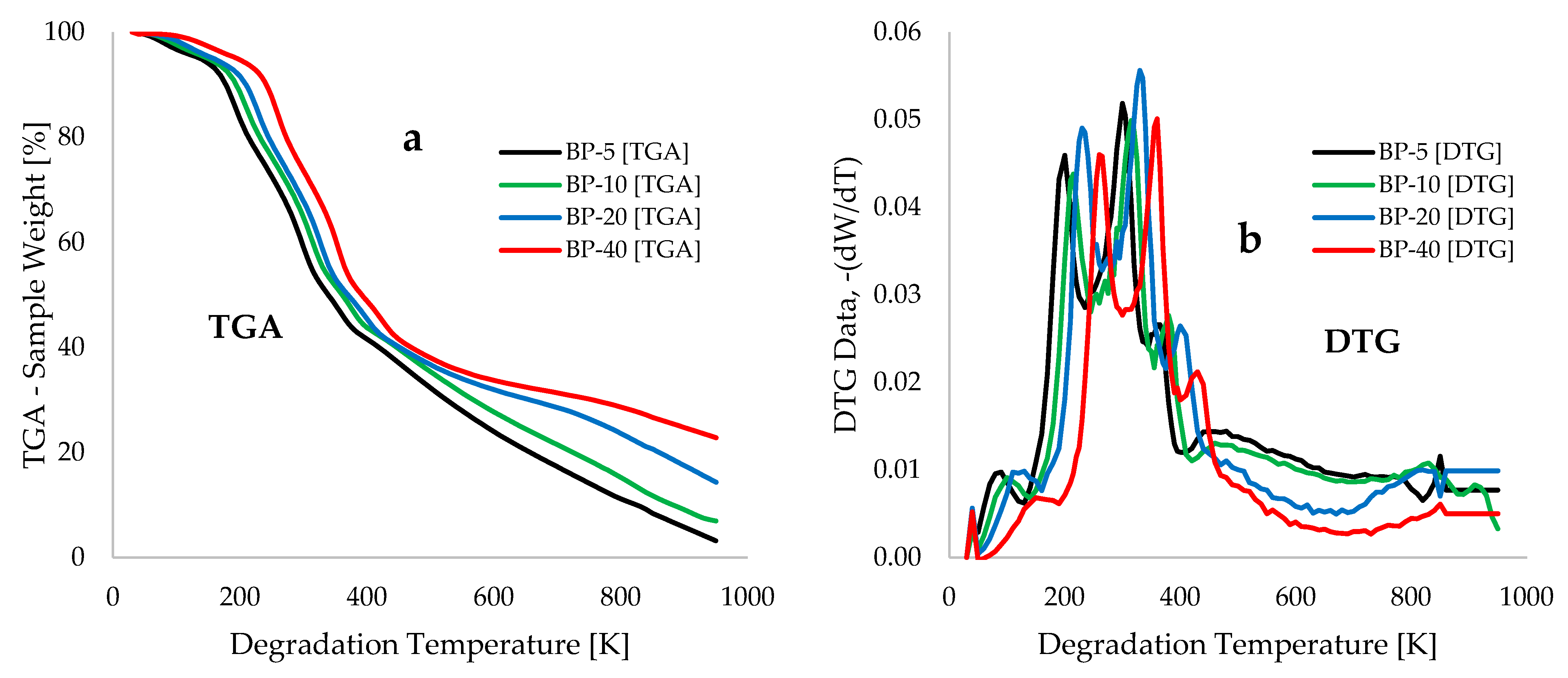 - Bedoui, A.; Souissi-Najar, S.; Ouederni, A. Thermal Degradation of Tunisian Olive Stines using Thermogravimetric Analysis (TGA). Int. J. Innov. Appl. Sci. 2016, 18, 938–950. Available online: https://ijias.issr-journals.org/abstract.php?article=IJIAS-16-227-05 (accessed on 29 September 2025).