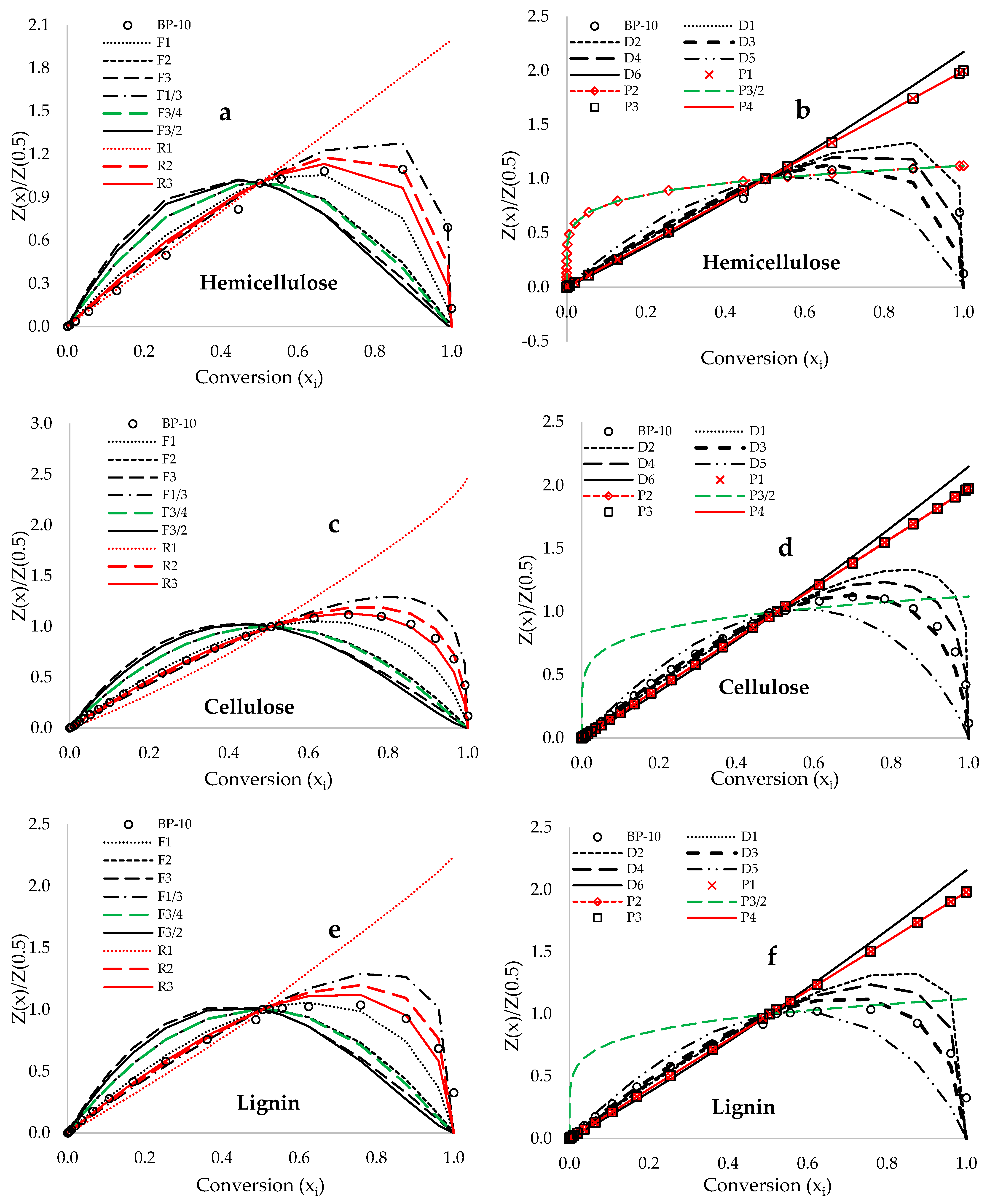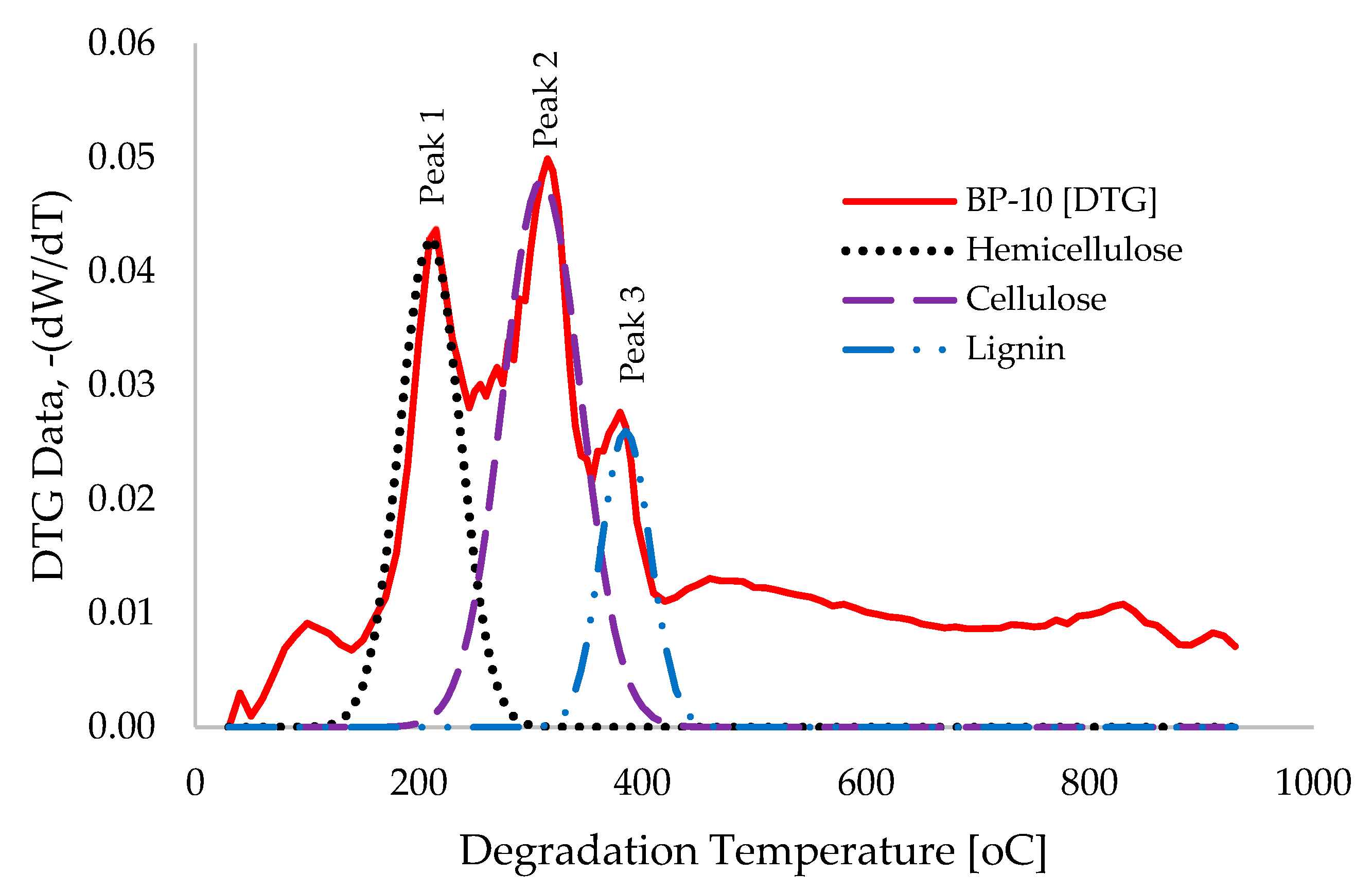 - Kim, H.; Yu, S.; Kim, M.; Ryu, C. Progressive Deconvolution of Biomass Thermogram to Derive Lignocellulosic Composition and Pyrolysis Kinetics for Parallel Reaction Model. Energy 2022, 254, 124446. [Google Scholar] [CrossRef]