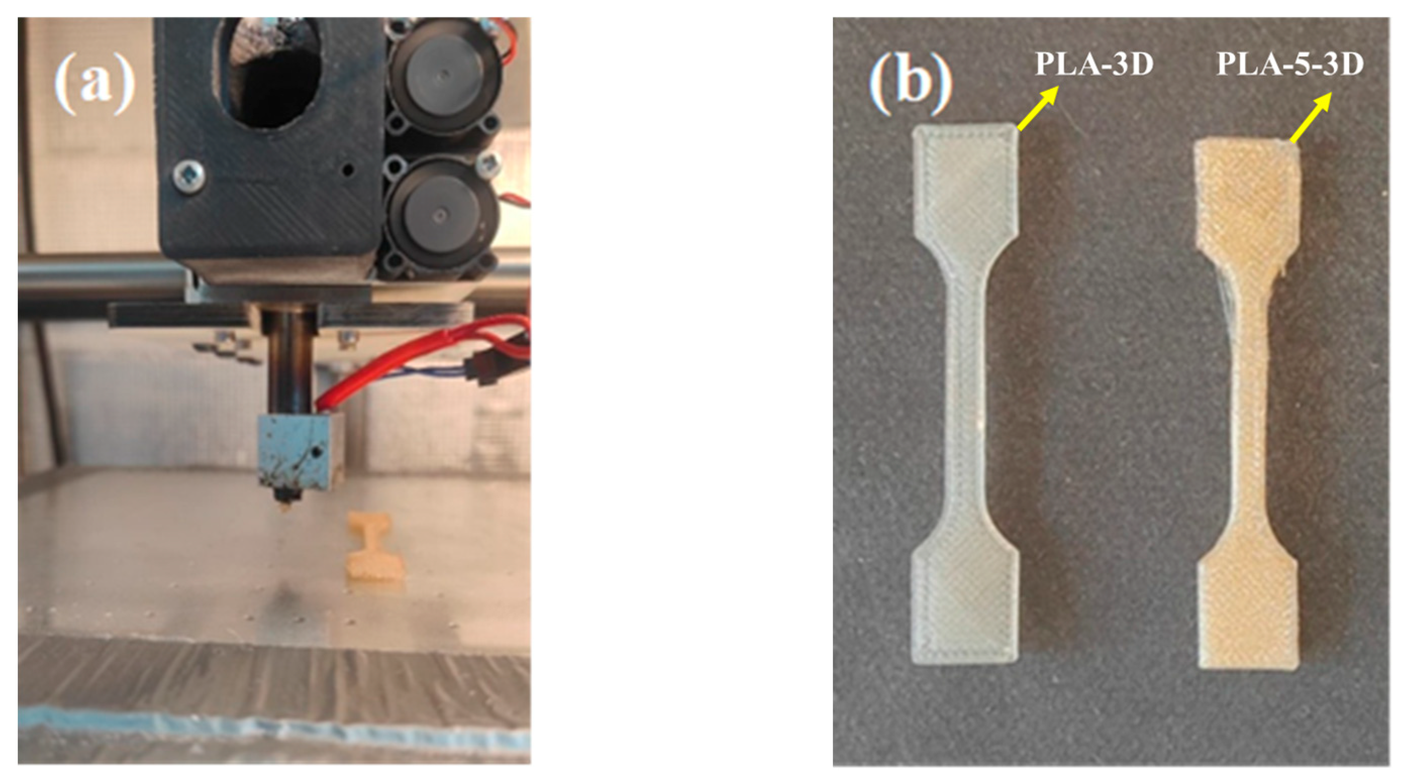 Figure 2. Three-dimensionally printed PLA-based composites: (a) printing process; (b) printed tensile specimens.