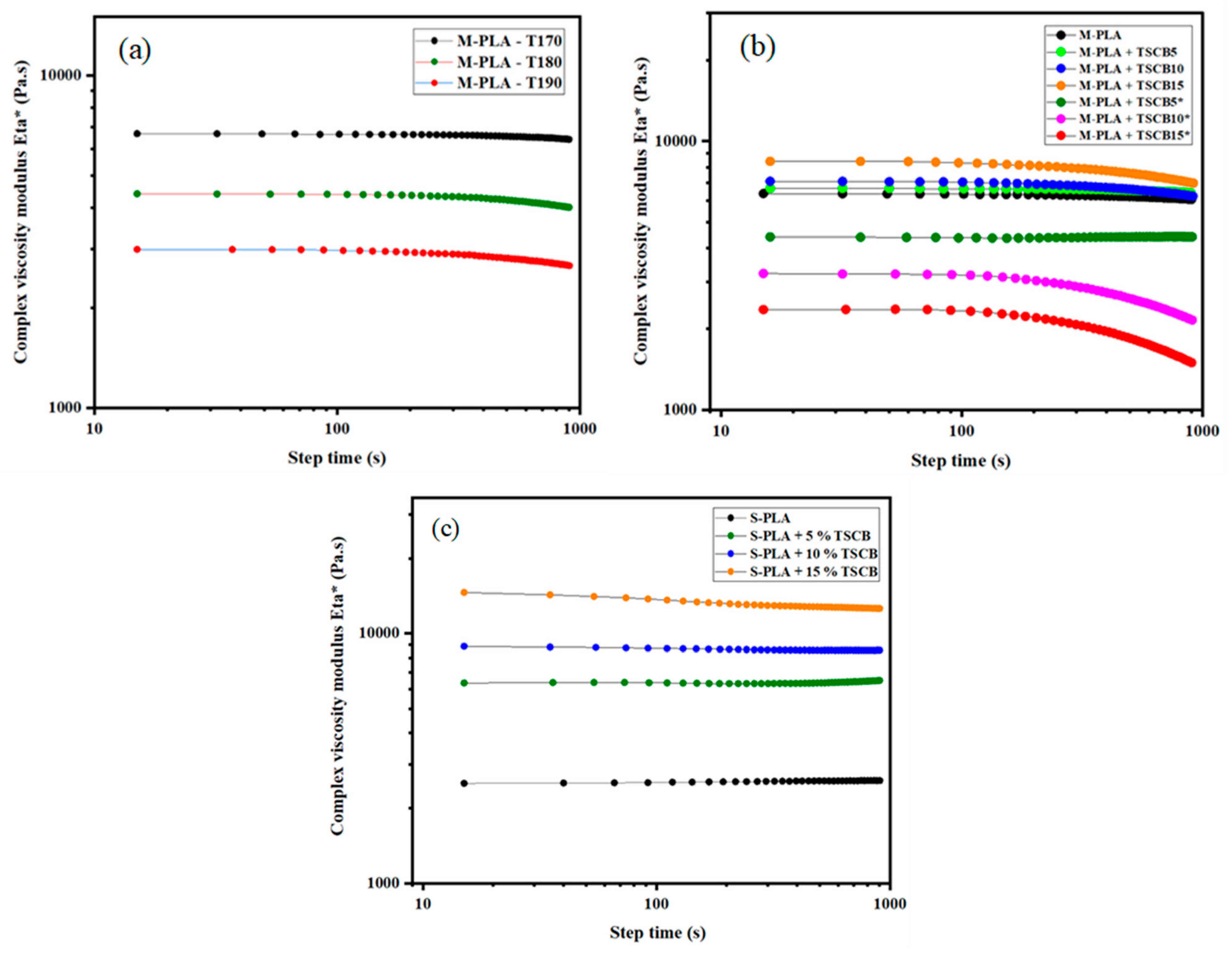 Figure 4. Results of (a) complex viscosity modulus versus time t of neat PLA at various temperatures. (b) Influence of fiber surface treatment on the viscosity modulus versus time of PLA-TSCB bio-composites prepared in the molten state at 170 °C (the * indicates the non-neutralized fibers). (c) Evolution of complex viscosity of PLA and its bio-composites prepared by solvent casting at 170 °C.
