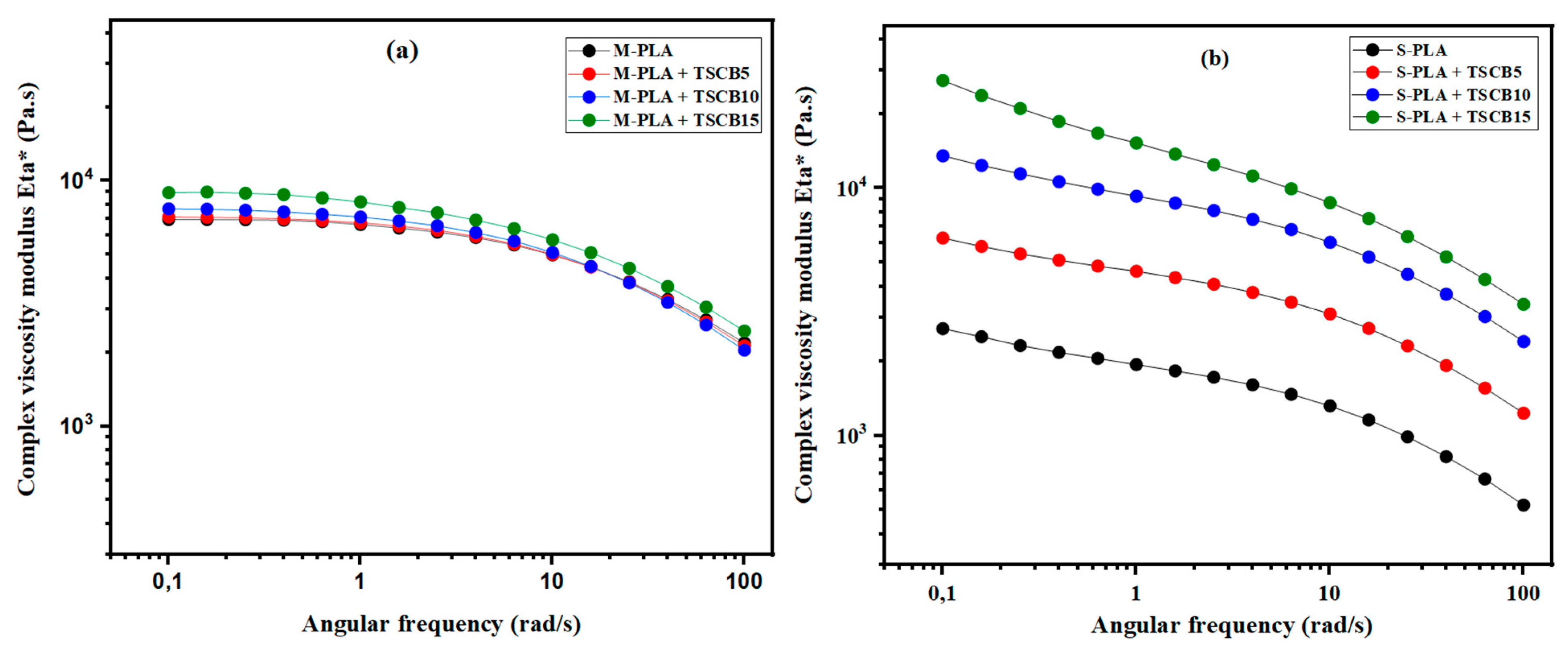 Figure 6a presents the evolution of the complex viscosity (η*) as a function of frequency for neat PLA and its bio-composites reinforced with sugarcane bagasse fibers (TSCB) prepared via the melt-processing route. All samples exhibit a nearly flat plateau in the low- to mid-frequency range, followed by a clear shear-thinning behavior at higher frequencies. The incorporation of TSCB fibers systematically increases viscosity across the entire frequency spectrum, with the effect becoming more pronounced as fiber content rises. This behavior is characteristic of reinforced composites, where strong fiber–matrix interactions hinder polymer chain mobility, leading to higher flow resistance. As fiber loading increases, the non-Newtonian character of the composites becomes more evident, especially in the high-frequency region where the applied shear partially disrupts the internal fiber–matrix network.