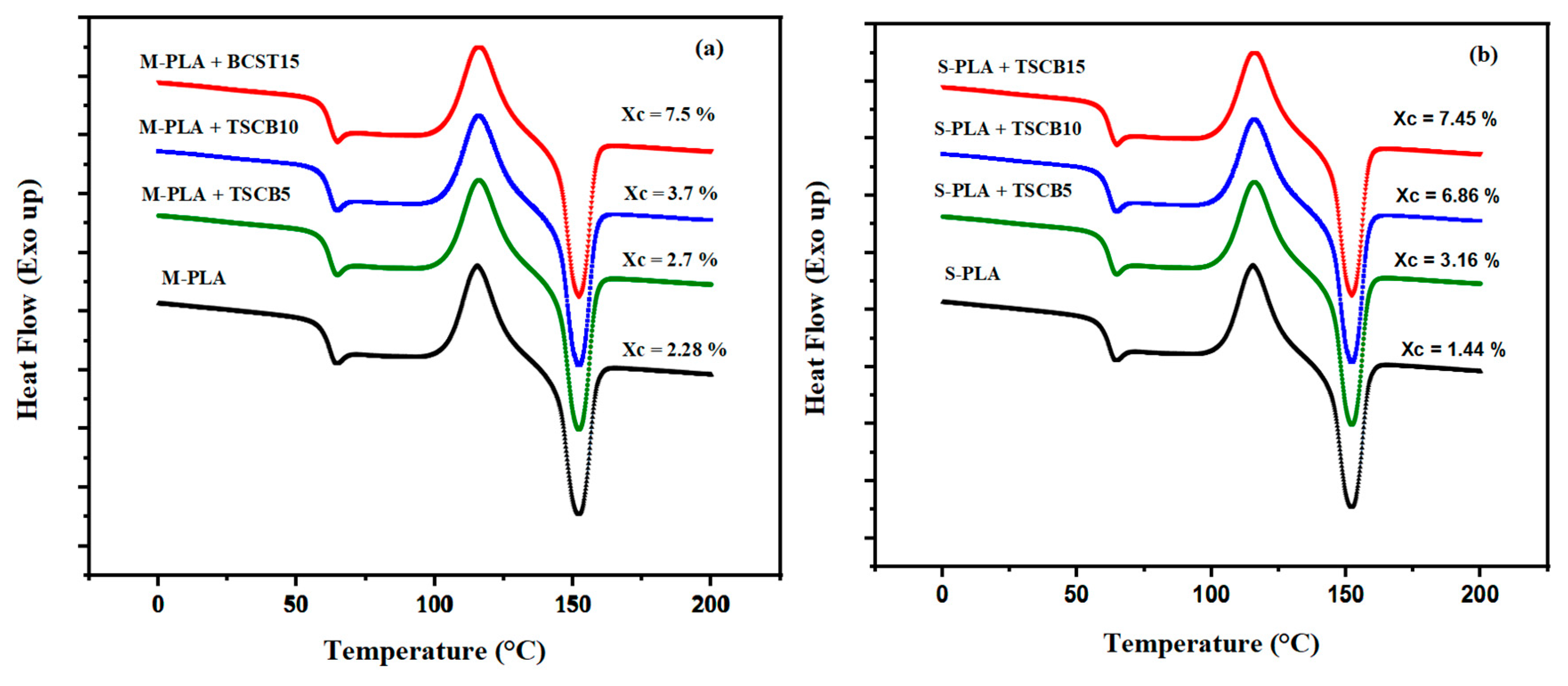 Figure 8. DSC thermograms (second heating cycle) of neat PLA and PLA/TSCB bio-composites prepared via (a) melt processing and (b) solvent casting method.