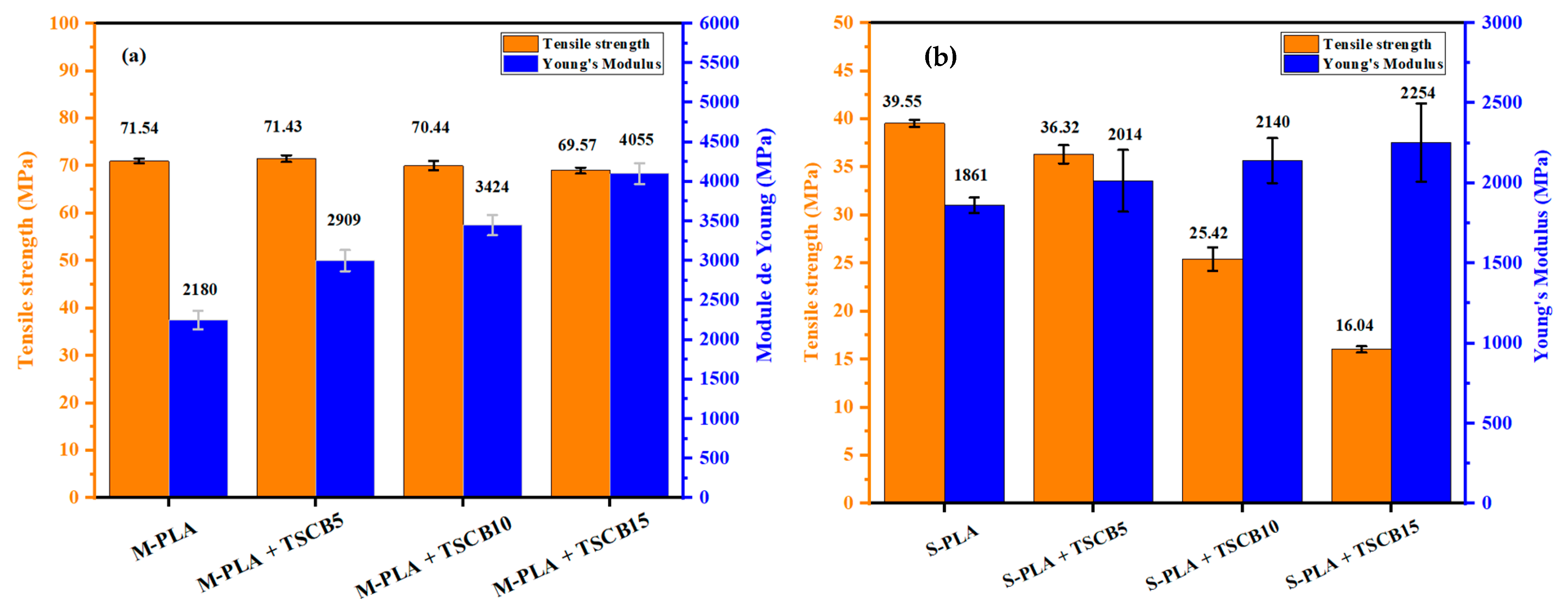 Figure 9. Evolution of Young’s modulus and tensile strength of neat PLA and PLA/TSCB bio-composites prepared via (a) melt processing and (b) solvent casting method.