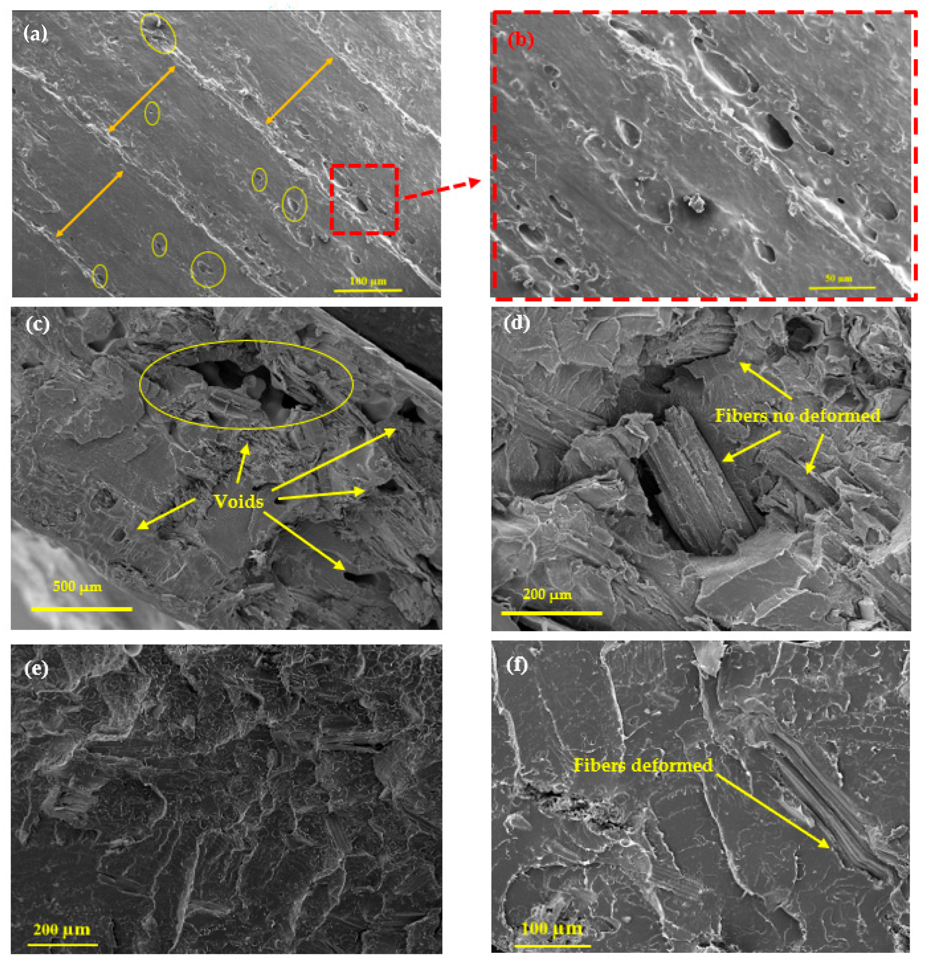 Figure 11. SEM Images of the fracture surface after tensile testing of the 3D-printed samples (a) PLA-5-3D; (b) PLA-5-3D (close-up view); (c) PLA-15-3D; (d) PLA-15-3D (close-up view); and injected specimens (e) PLA-15-inj and (f) PLA-5-inj.