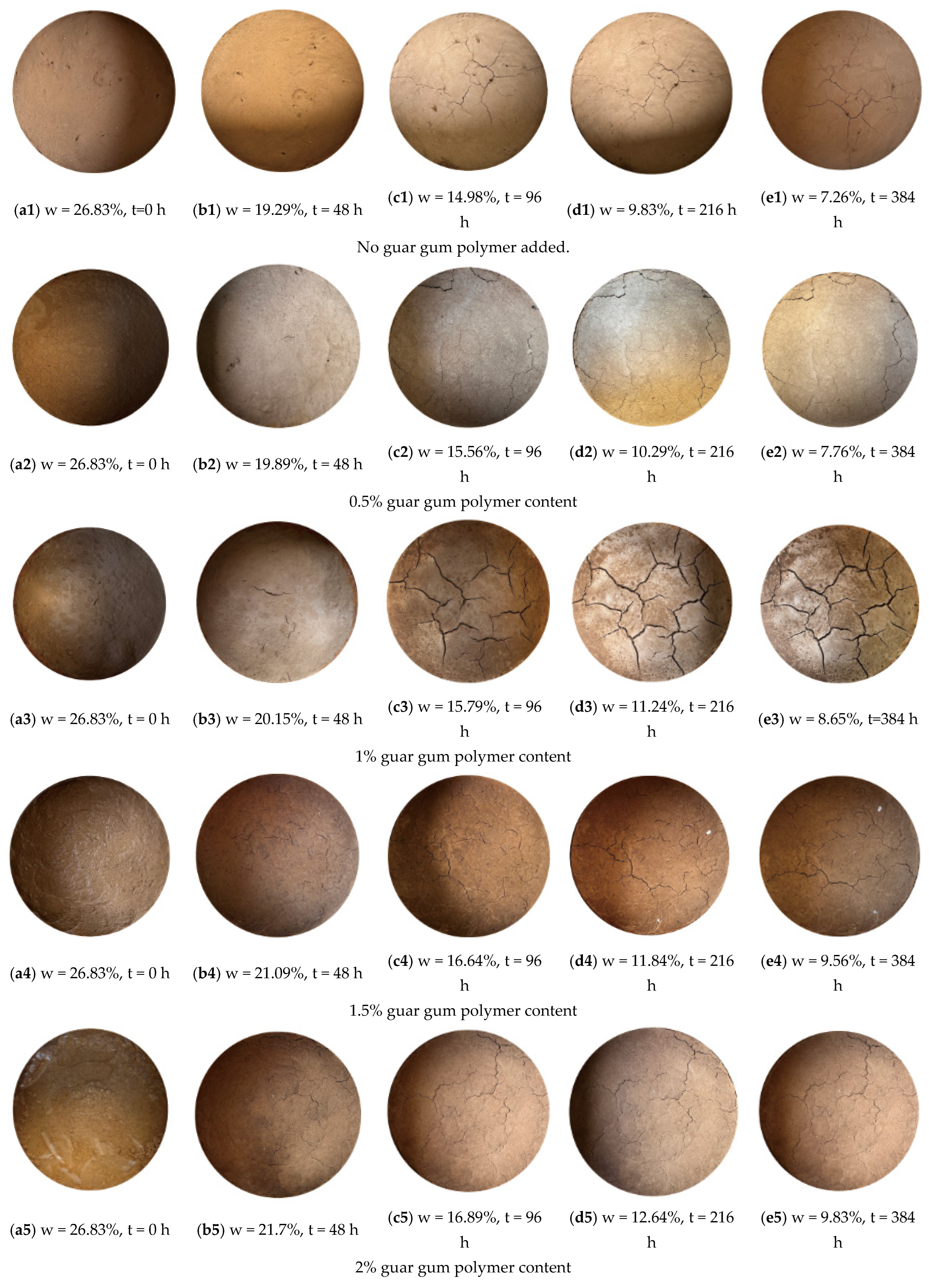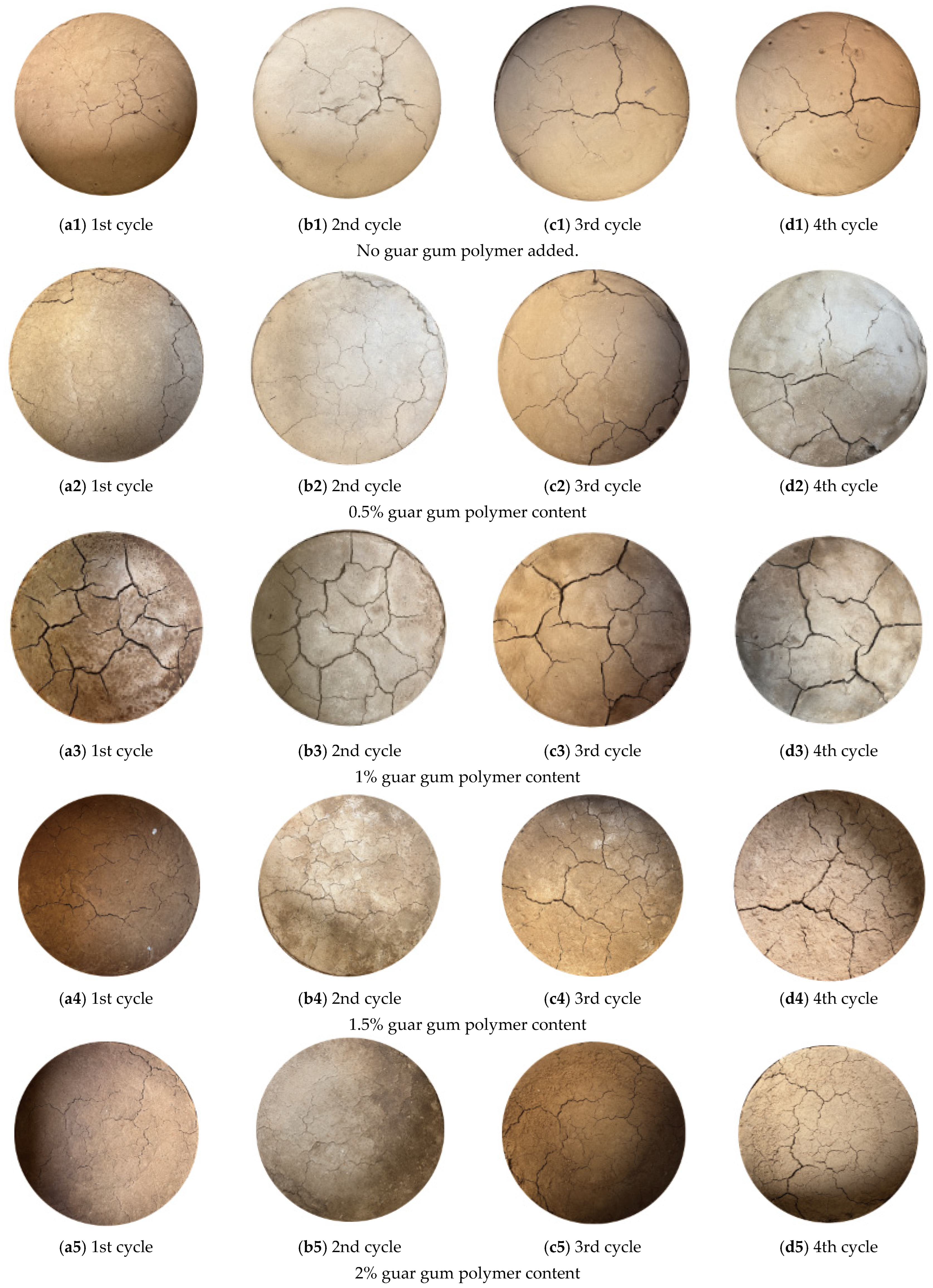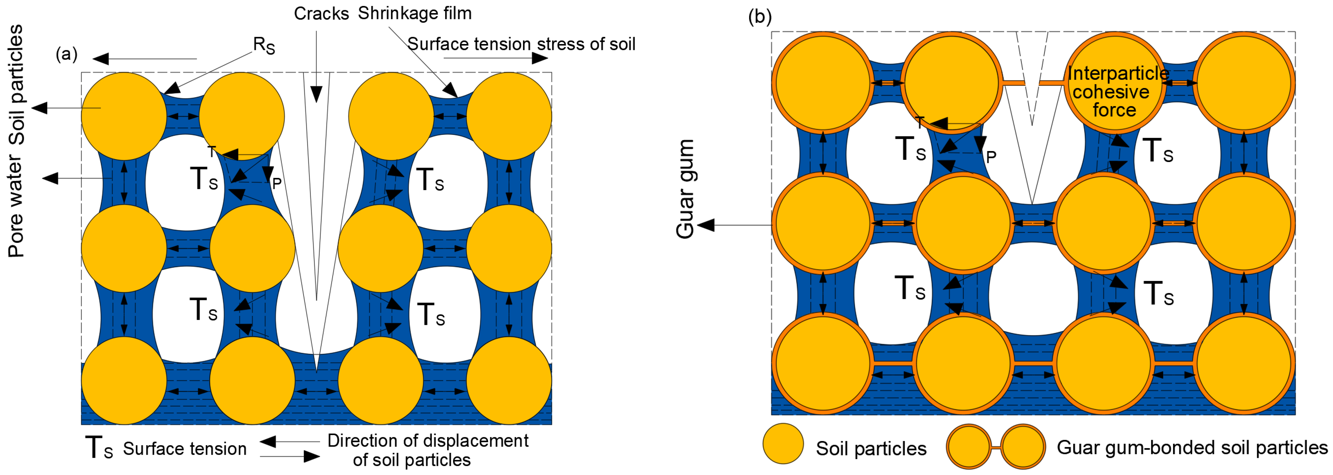 - Jiang, X.; Hou, W.; Zhang, D.; Guo, Z.; Wang, D.; Wang, X. Experimental Study on Crack Evolution Characteristics in Guar Gum Polymer-Modified Silty Clay. Polymers 2025, 17, 1841. [Google Scholar] [CrossRef] [PubMed]