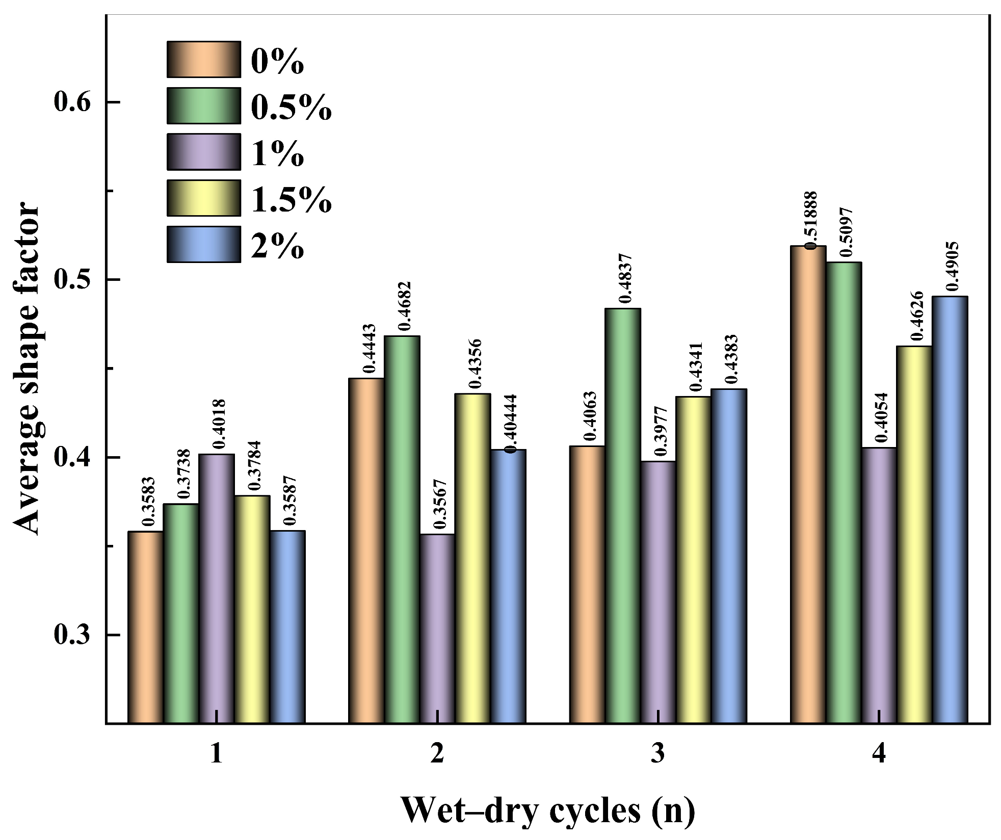 3.3.4. Effect of Wetting–Drying Cycles on the Crack Shape Factor