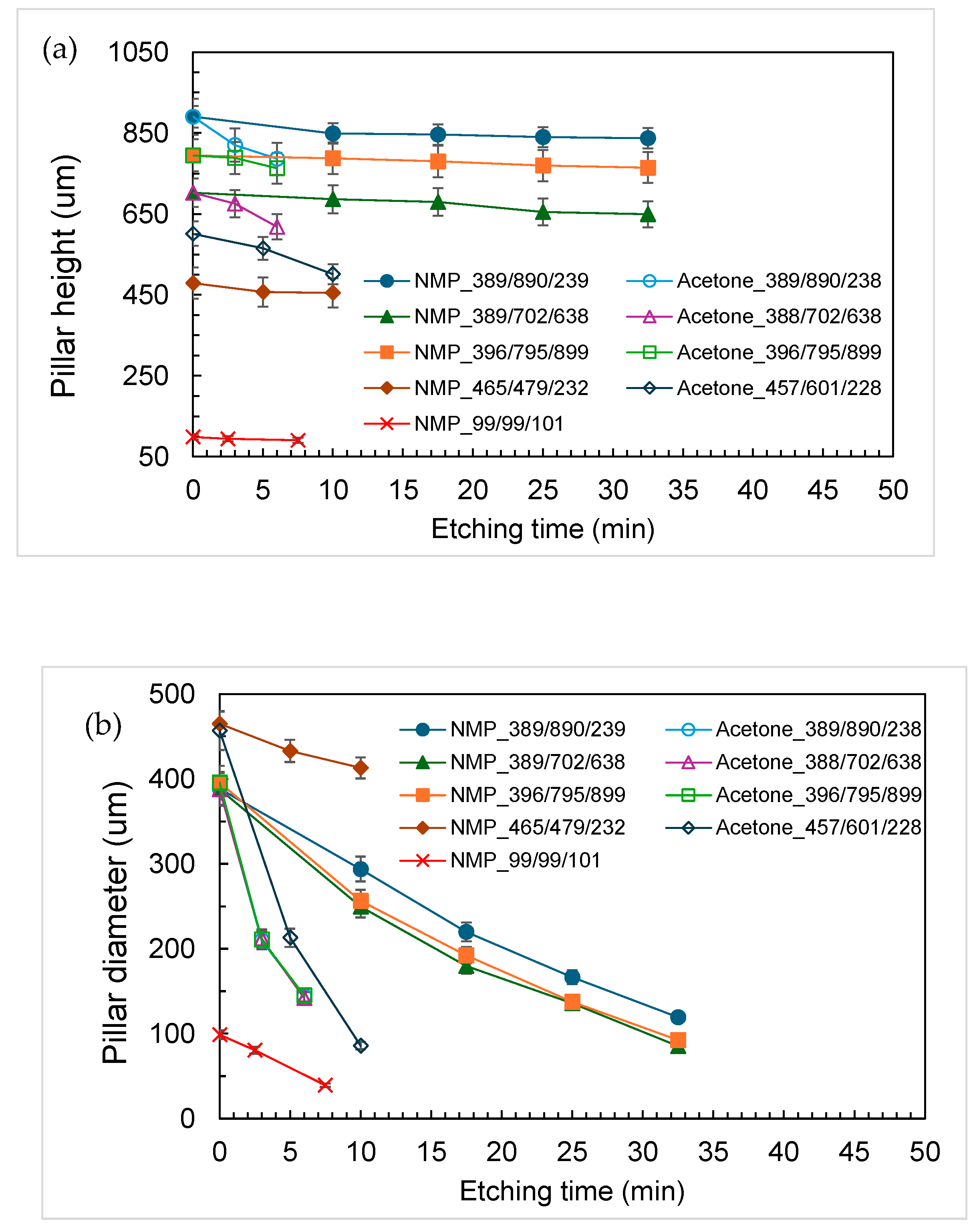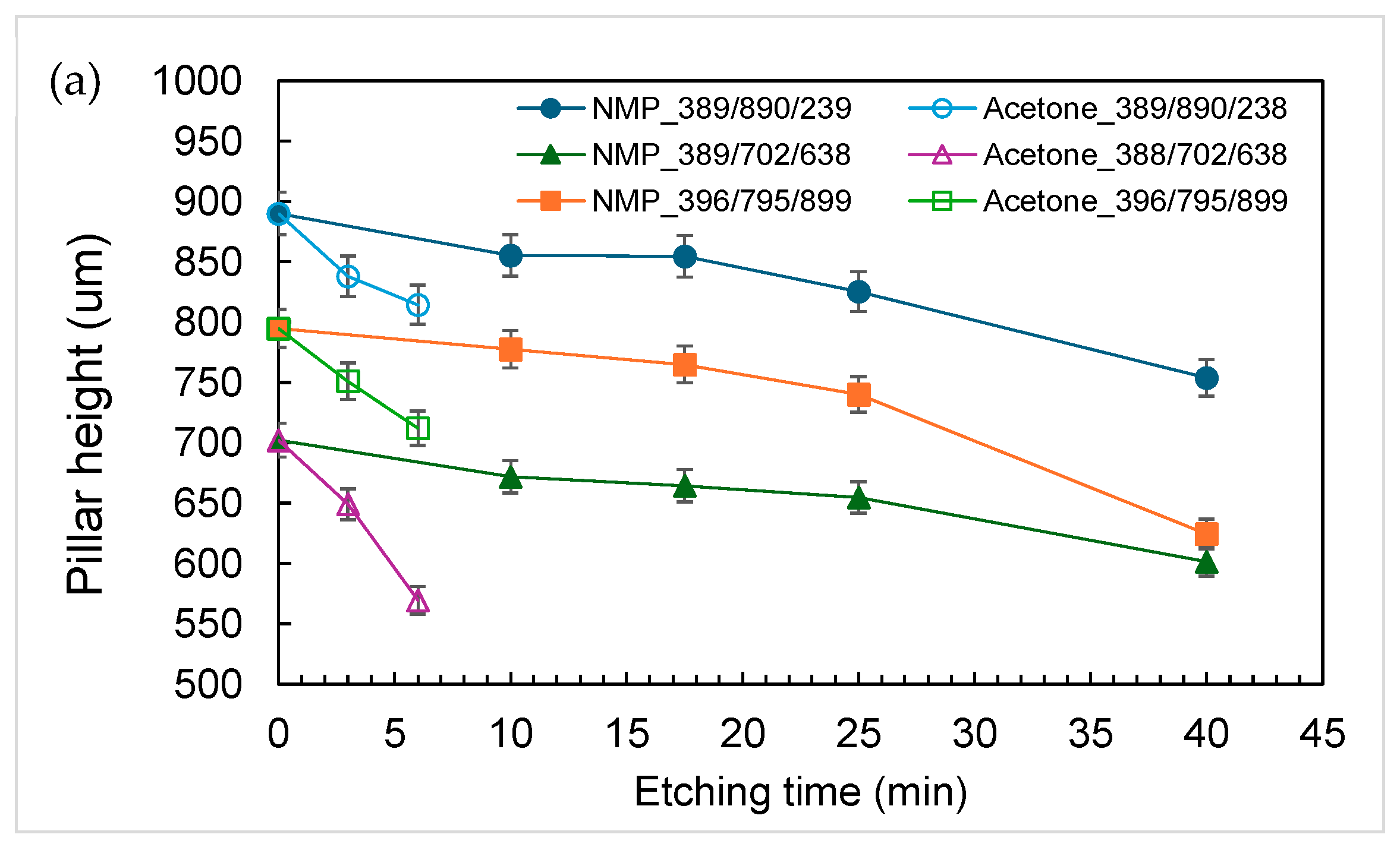 - Deng, Y.-L.; Juang, Y.-J. Polydimethyl siloxane wet etching for three dimensional fabrication of microneedle array and high-aspect-ratio micropillars. Biomicrofluidics 2014, 8, 026502. [Google Scholar] [CrossRef]