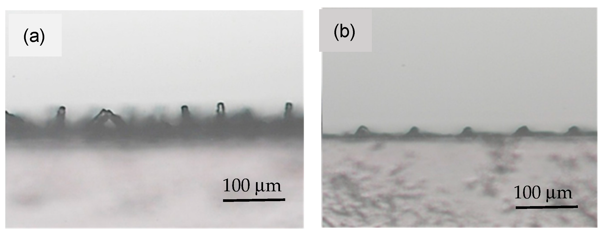 - Wu, S.; Du, J.; Xu, S.; Lei, J.; Ma, J.; Zhu, L. Ultrasonic Plasticizing and Pressing of High-Aspect Ratio Micropillar Arrays with Superhydrophobic and Superoleophilic Properties. Processes 2024, 12, 856. [Google Scholar] [CrossRef]