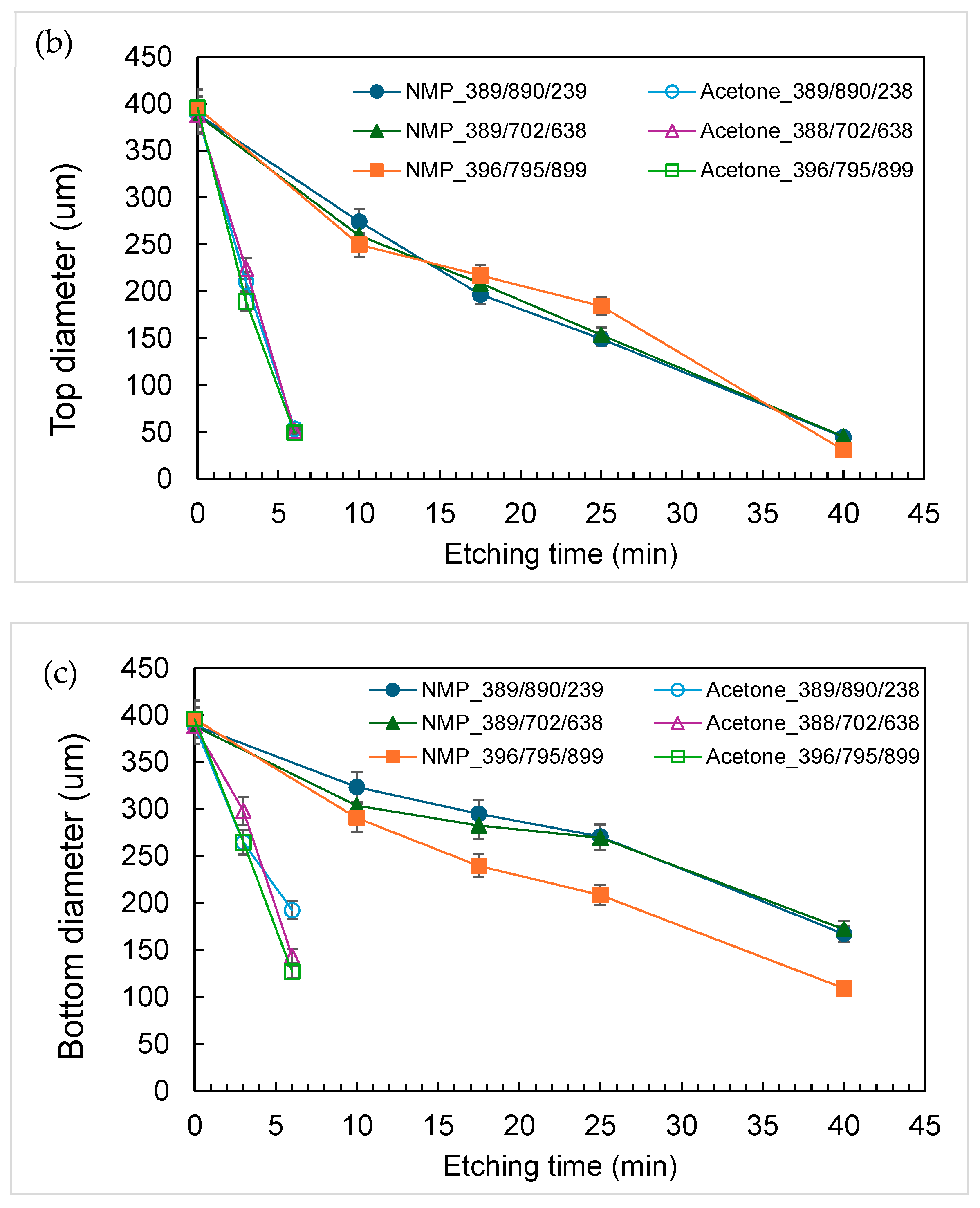 - Kleiman, M.; Ryu, K.A.; Esser-Kahn, A.P. Determination of factors influencing the wet etching of polydimethylsiloxane using tetra-n-butylammonium fluoride. Macromol. Chem. Phys. 2016, 217, 284–291. [Google Scholar] [CrossRef]