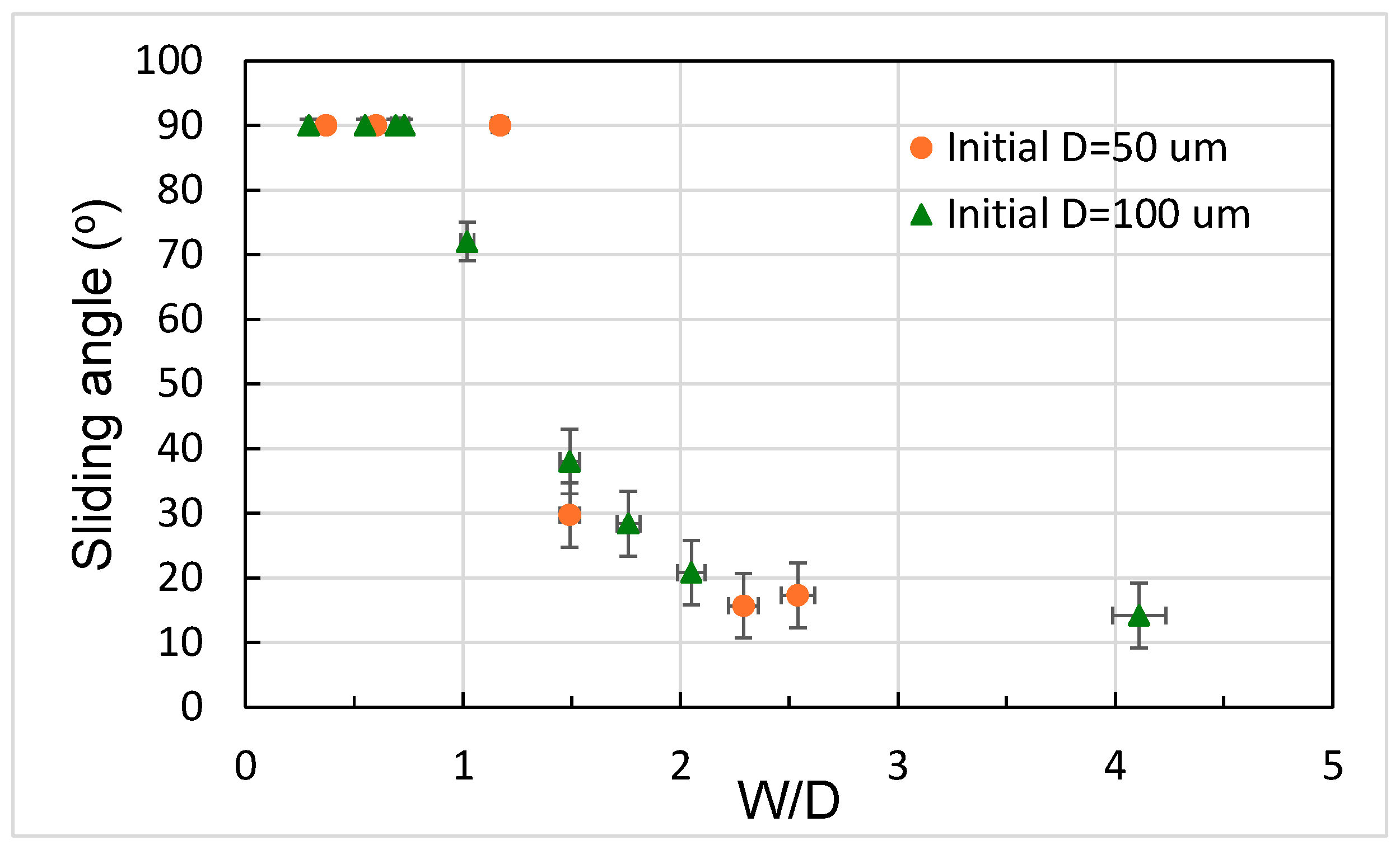 3.2. Analysis of Contact Angles, Sliding Angles, and States of Droplets