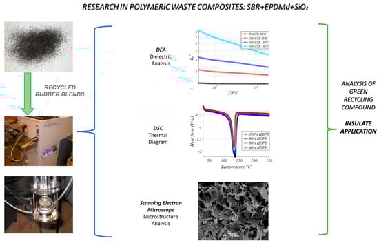- Marín-Genescà, M.; Mujal-Rosas, R.; García-Amorós, J.; Mudarra, M.; Ramis Juan, X.; Colom Fajula, X. Study Analysis of Thermal, Dielectric, and Functional Characteristics of an Ethylene Polyethylene Diene Monomer Blended with End-of-Life Tire Microparticles Amounts. Polymers 2021, 13, 509. [Google Scholar] [CrossRef]