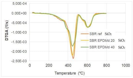 The TGA results provide evidence of the thermodynamic compatibility among SBR, EPDM, and SiO2. A single-step thermal degradation and an increase in onset temperature upon the addition of silica suggest a good miscibility of the polymer phases and effective filler dispersion. Regarding thermal behavior, we see, in Figure 2, how it has great similarities in the range from 30 to 450 °C, but from this point on the effect of SiO2 is noticeable, with an increase in the Loss Weight (Y axis) for compounds in the presence of SiO2.