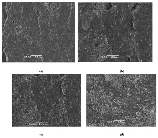 Despite the presence of silica particles and certain discontinuities in the images, due to the irregular incorporation of SBR with EPDMd, a homogeneity is observed in the analyzed samples, so we deduce that these samples have been developed with the correct procedures and methods, avoiding the agglomeration of the additive in the samples. The discontinuities in the analyzed composites grow with the incorporation of silica; other structural studies show the presence of silica [24,25,26].
