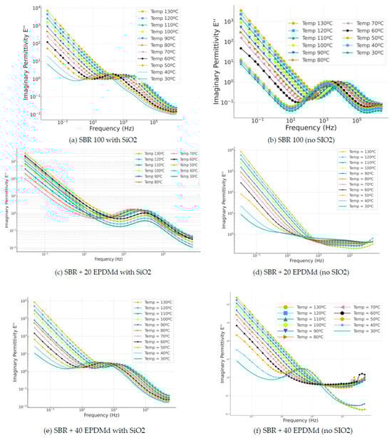 Imaginary permittivity part (ε”) versus frequency (Hz) in temperature dependence (°C) of Styrene Butadiene Rubber (SBR) and SBR-EPDMd composites, with SiO2 and no SiO2 addition: (a) SBR 100 with SiO2; (b) SBR 100; (c) SBR 100 + 20EPDMd with SiO2; (d) SBR + 20%EPDMd; (e) SBR 100 + 20EPDMd with SiO2; (f) SBR + 40%EPDMd.