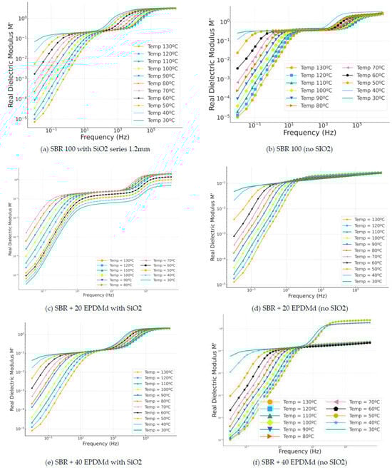 Real modulus part (M′) versus frequency (Hz) in temperature dependence (°C) of Styrene Butadiene Rubber (SBR) and SBR-EPDMd composites, with SiO2 and no SiO2 addition: (a) SBR 100 with SiO2; (b) SBR 100; (c) SBR 100 + 20EPDMd with SiO2; (d) SBR + 20%EPDMd; (e) SBR 100 + 20EPDMd with SiO2; (f) SBR + 40%EPDMd.