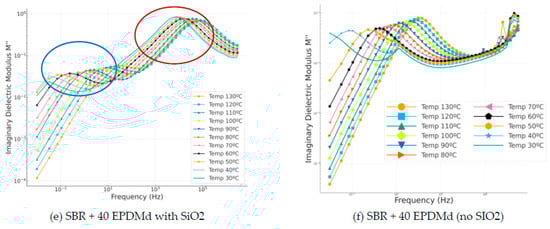 In this case, in Figure 5, the incorporation of silica (Figure 5c) produces a reduction in the dielectric constant of 0.3 compared to the compound without silica (Figure 5d), in which we can observe how the dielectric constant is reduced linearly, with a less relevant reduction than with sample Figure 5c. In the SBR 40 EPDMd samples with SiO2 (Figure 5e), homogeneous behavior is observed as a function of temperature in the frequency range, but in Figure 5f, the SBR 40 EPDMd sample without silica, we see two differentiated behaviors (40–30 °C) and another for temperatures higher than 50 °C. It could be said that SiO2 produces a masking of the dielectric effects that we have without SiO2; that is, SiO2 is a dielectric material, but its dielectric characteristics allow the incorporation of SiO2 into SBR, showing a dielectric behavior like that of pure SBR. This is because SiO2 is itself an insulating material, so it does not significantly change the electrical properties of the composite.
