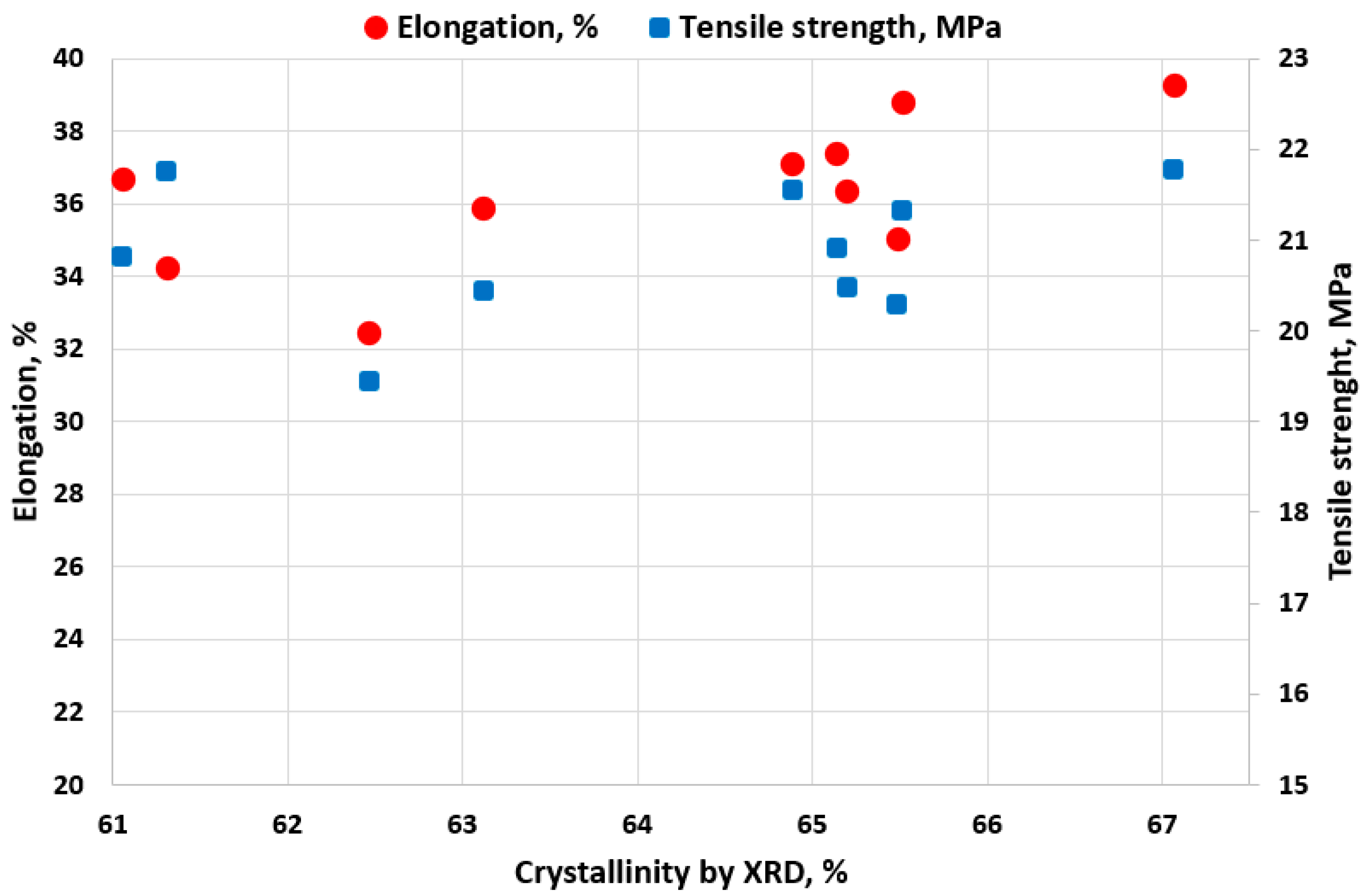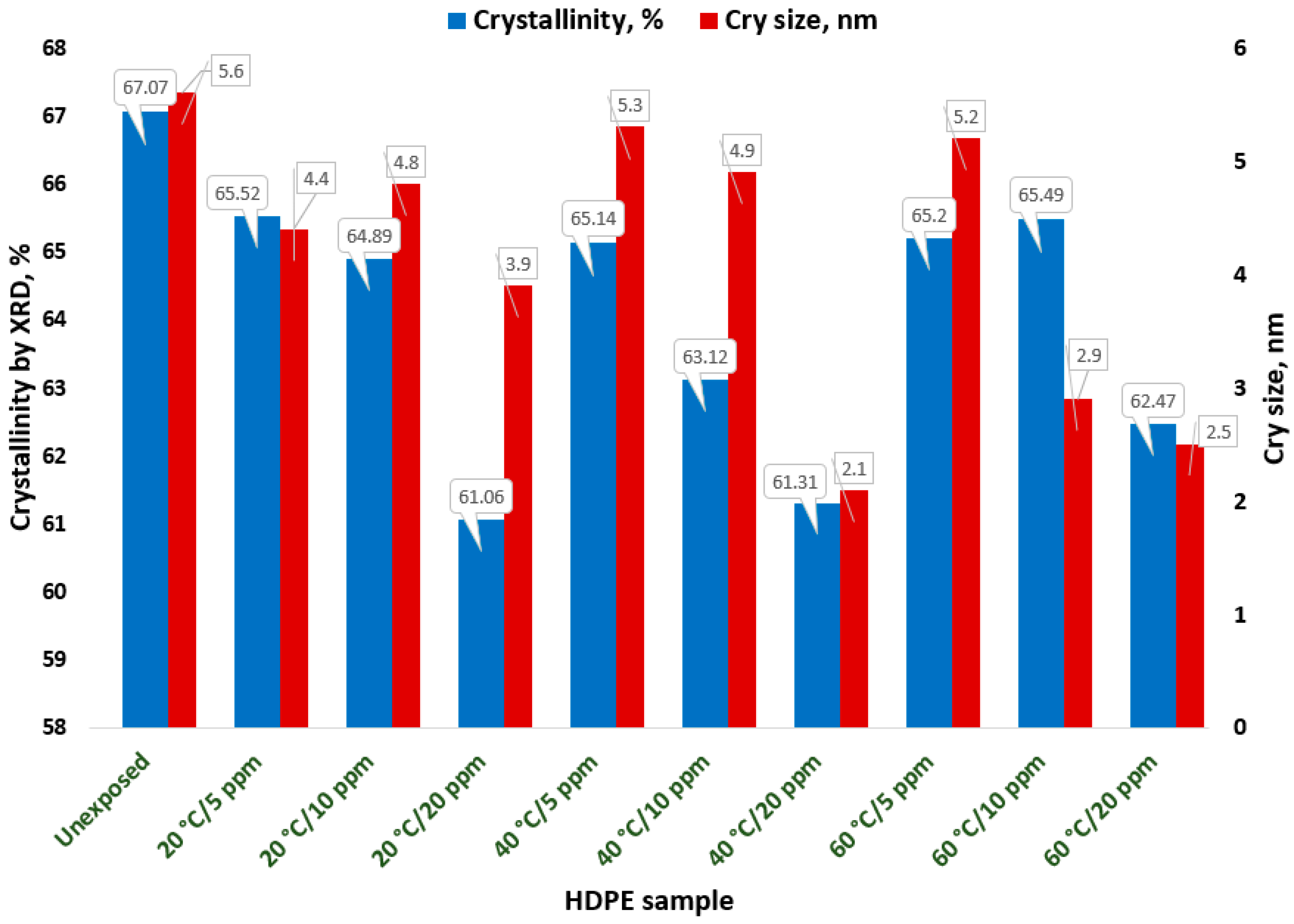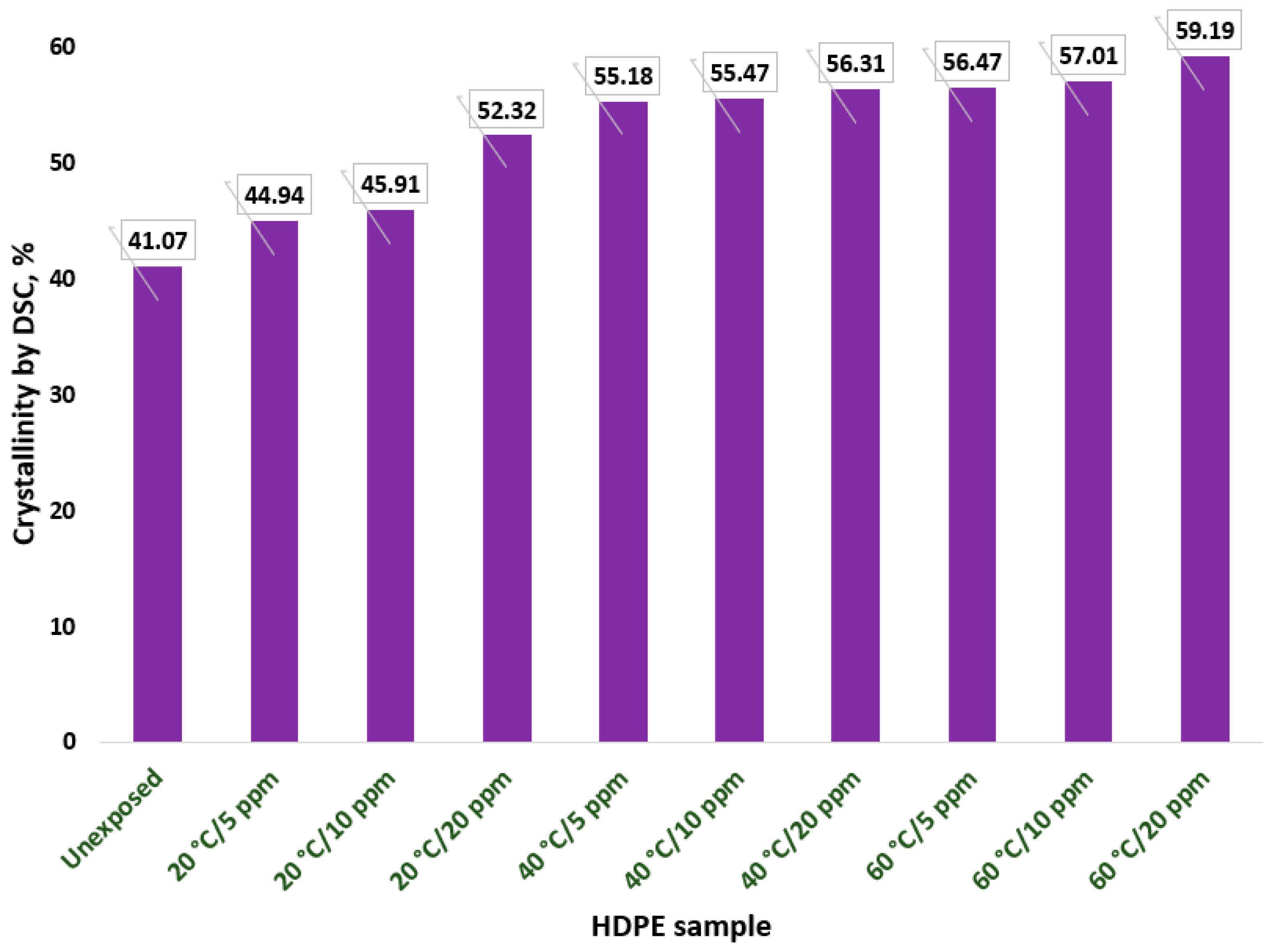 - DSC analysis indicated reductions in melting temperature (from 136.32 °C to 131.67 °C) and crystallinity changes up to 59.19%, reflecting the breakdown of amorphous regions and recrystallization of shorter chain fragments.