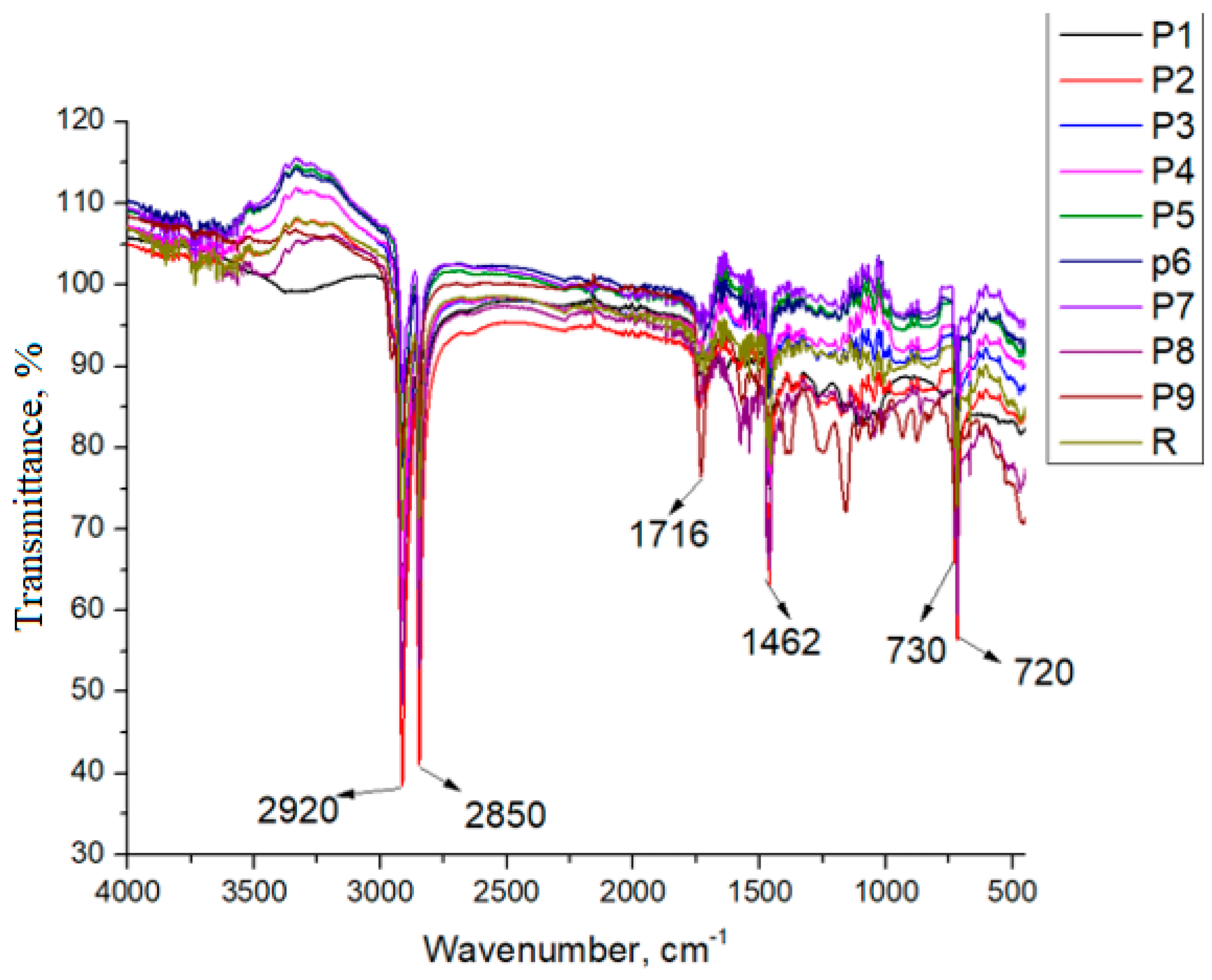 - Chemical changes identified by FTIR revealed progressive oxidation, including a pronounced increase in the carbonyl band (1716 cm−1) and the formation of additional oxygenated species, consistent with chlorine-induced chain scission.