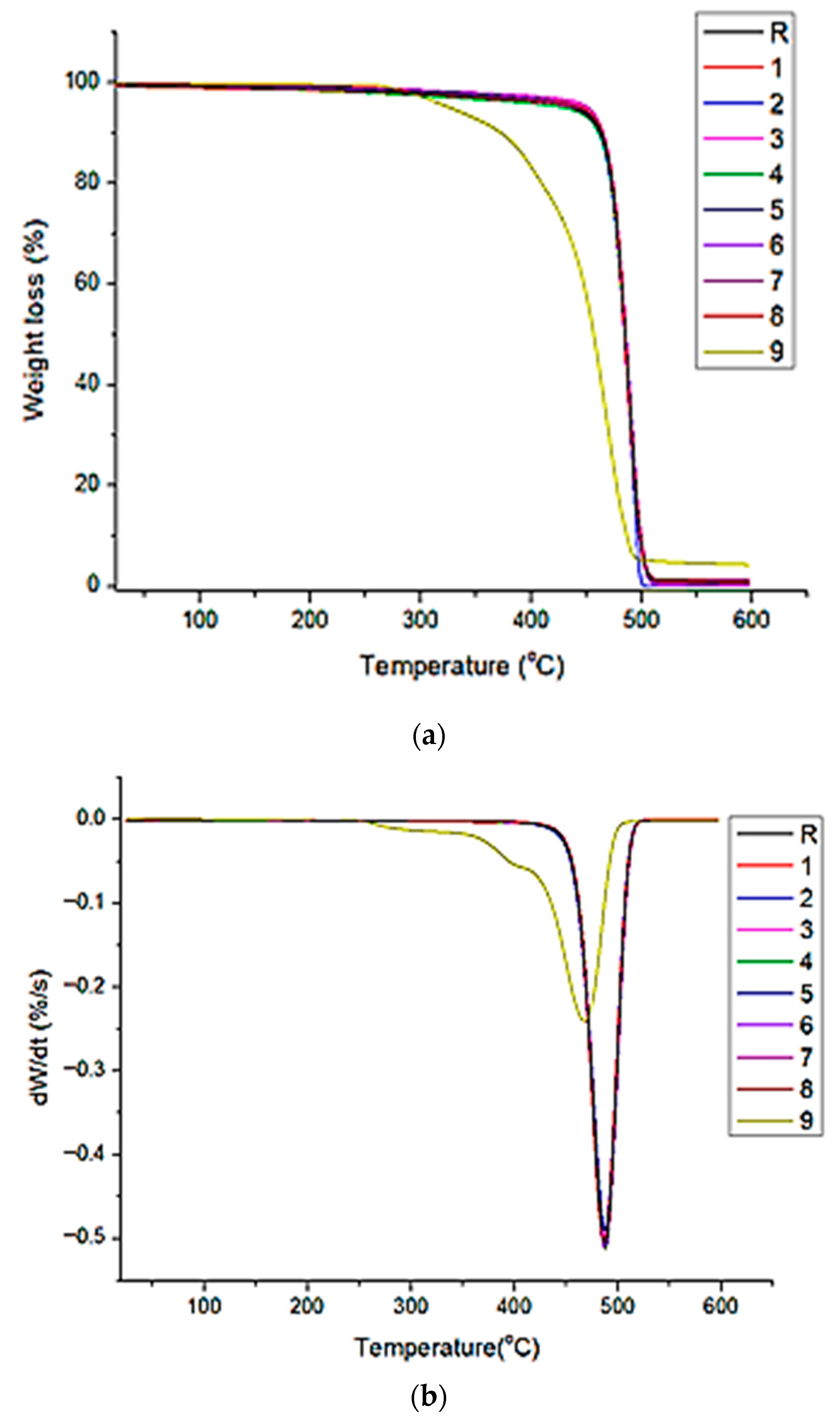 - Thermal stability decreased substantially, as TGA showed T5% dropping from 450 °C (reference) to 326.99 °C under the most aggressive aging conditions, along with the appearance of a secondary degradation peak at 398 °C.