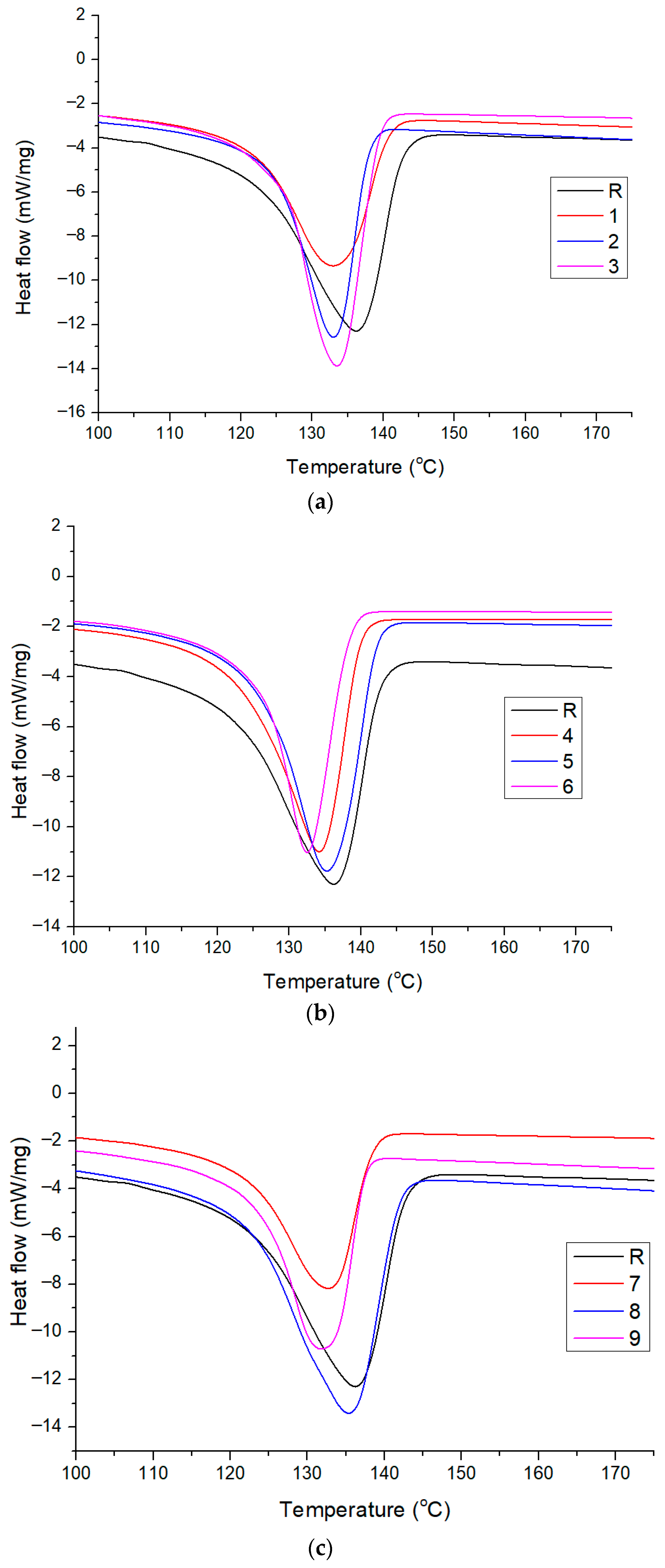 | Sample | Maximium Degradation Temperature (Td) (°C) | T5% (°C) | T50% (°C) | T95% (°C) | Tm (°C) | Xc (%) |