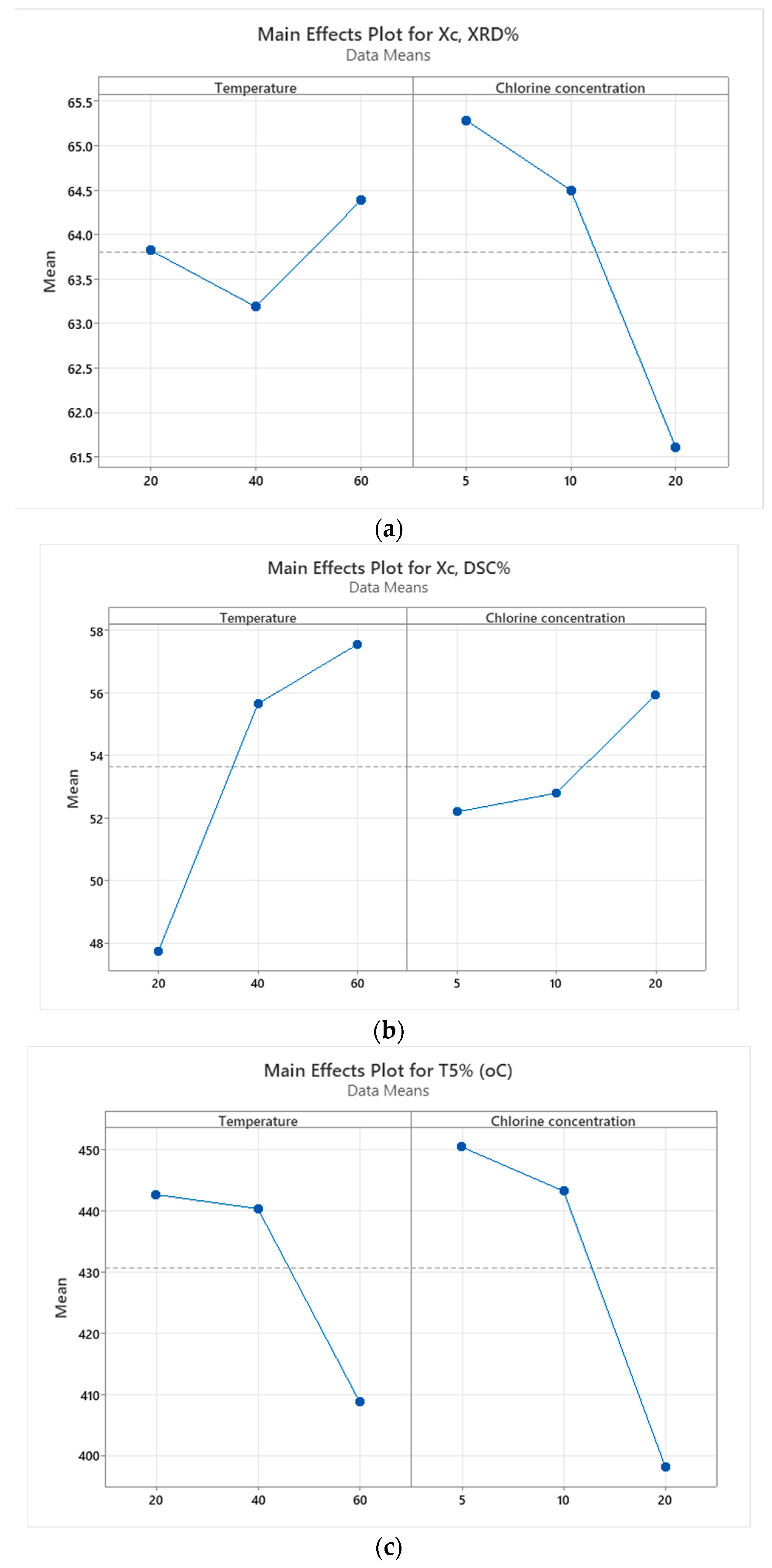 - Structural degradation was confirmed by XRD, with crystallinity decreasing from 67.07% (reference) to ~61% at high chlorine levels, and crystallite size shrinking from 5.60 nm to 2.10–2.50 nm, indicating loss of molecular ordering in surface layers.