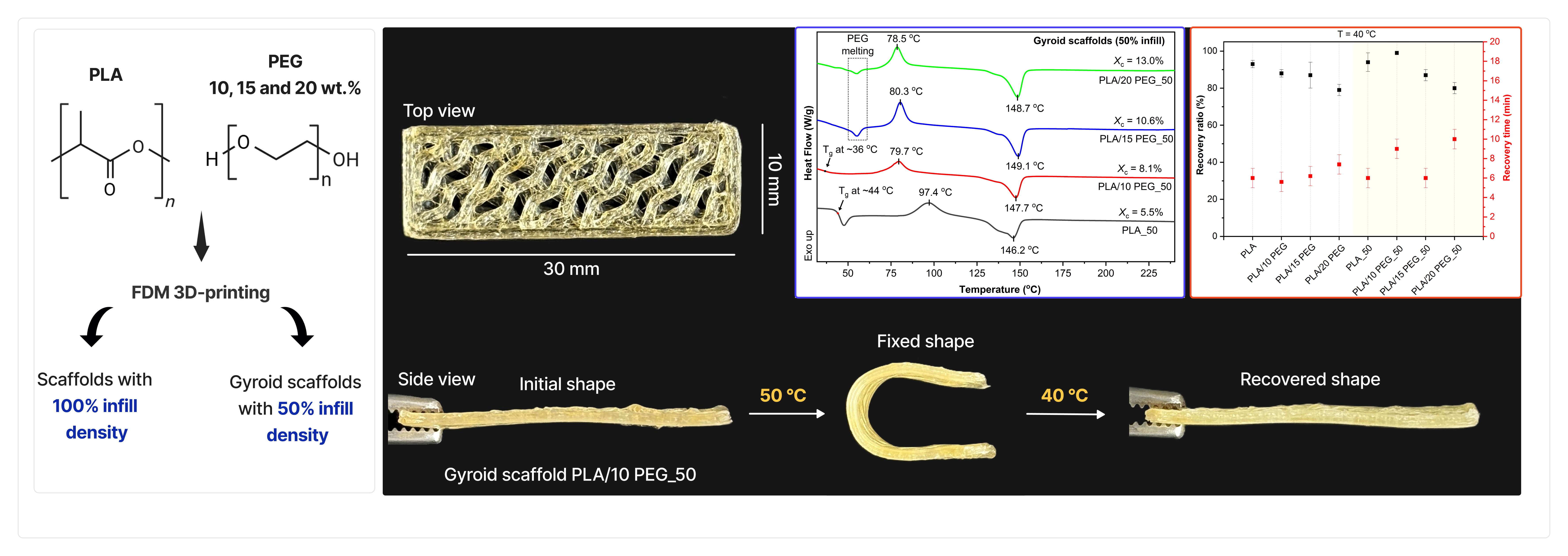 This study aims to address these gaps by (i) preparing PLA/PEG blends with 10, 15, and 20 wt.% PEG, (ii) processing them into 3D-printed scaffolds with 100% and 50% gyroid infill using FFF, and (iii) correlating PEG content and infill density with thermal transitions, crystallinity, morphology, and thermally activated shape-memory behavior at 40 °C and 50 °C. By directly comparing dense and gyroid scaffolds with identical compositions and well–defined printing parameters, we clarify the effect of infill density on shape-memory performance and demonstrate how PEG concentration governs shape-memory response.