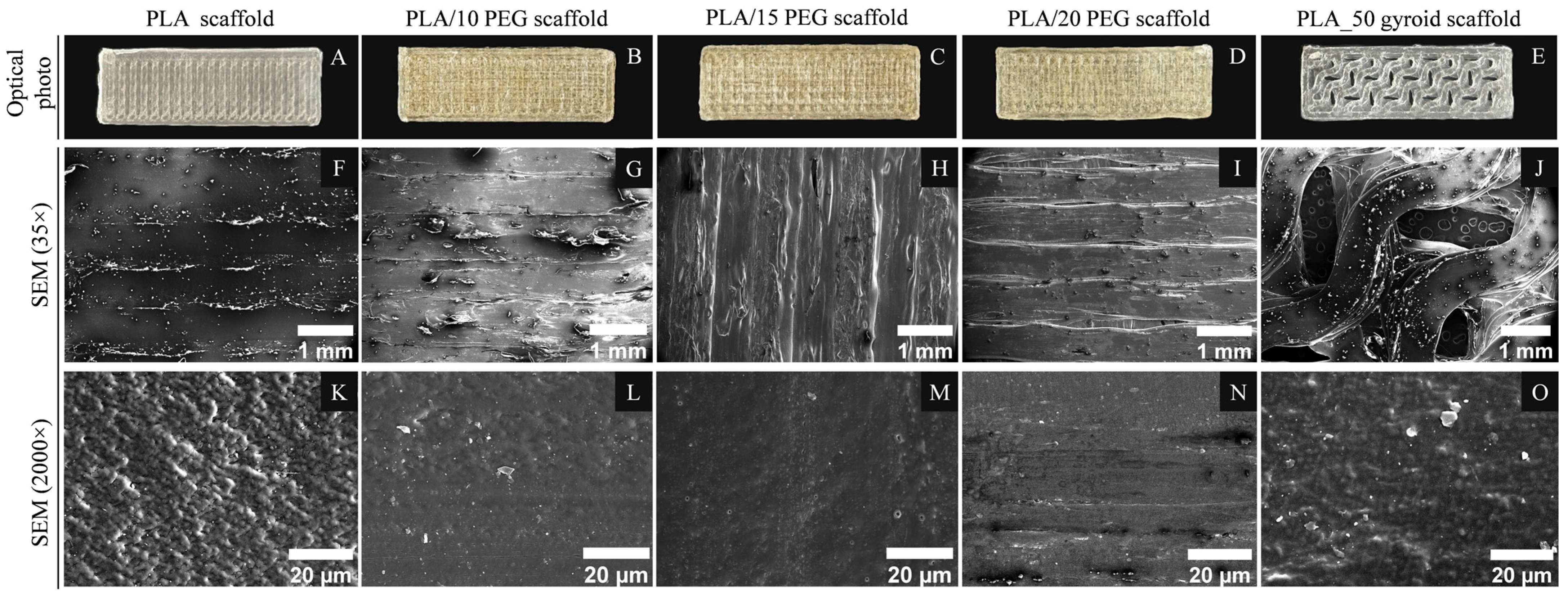 Figure 2B) show that all scaffolds exhibited dominant diffraction peaks at 2θ = 16.7° and 22.3°, which correspond to the (200)/(110) and (203) planes of the α crystal form of PLA. In PLA/PEG scaffolds, additional PEG diffraction peaks appeared at 19° and 23°, corresponding to the (115) and (016) planes of PEG [