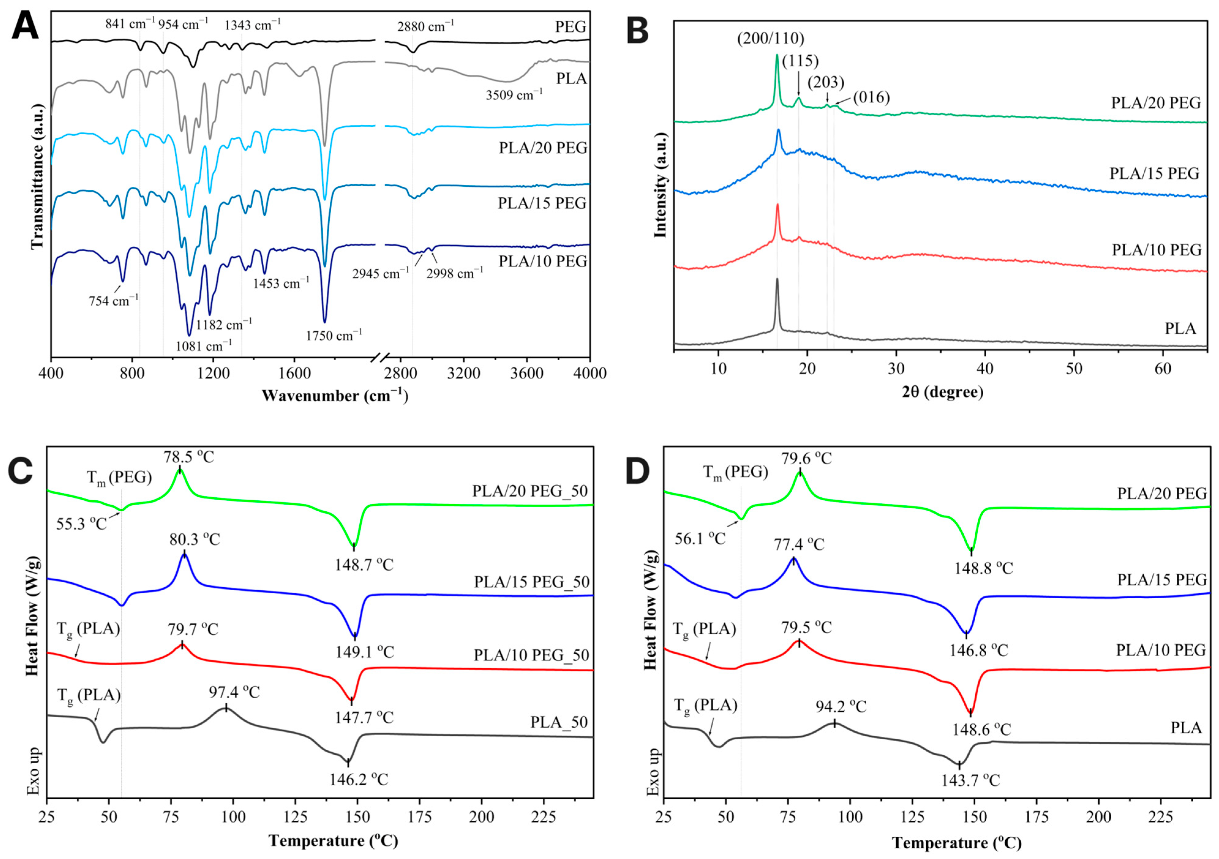 Upon PEG incorporation, the PLA’s C=O band at 1750 cm