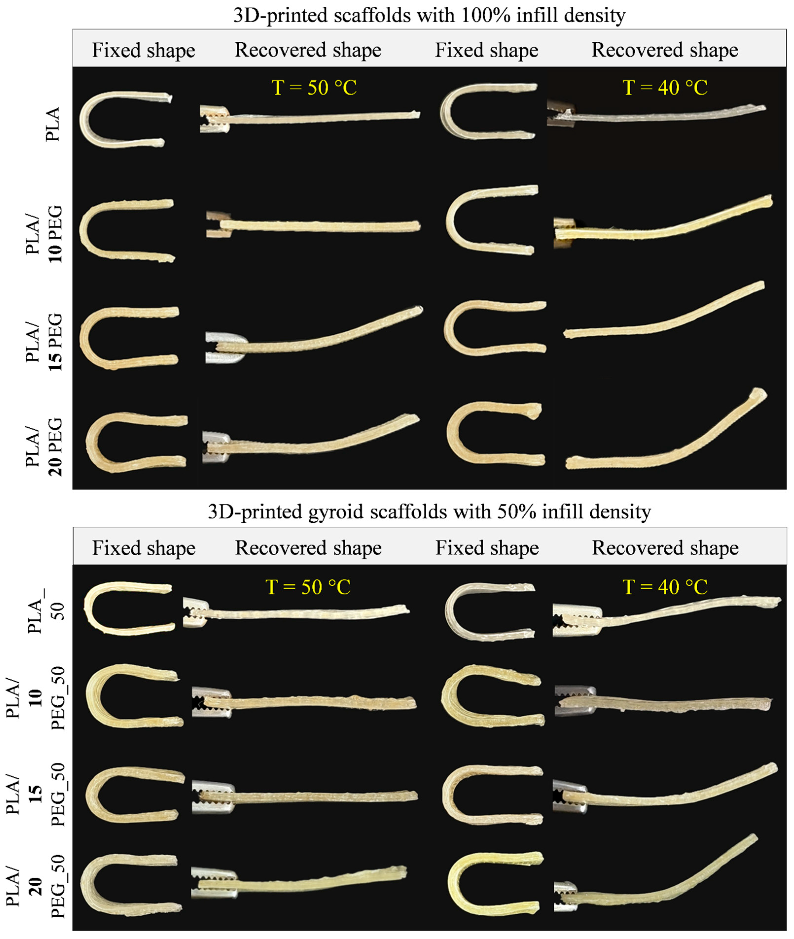 The shape-memory performance of 3D-printed scaffolds was evaluated at two activation temperatures (40 °C and 50 °C), and the corresponding