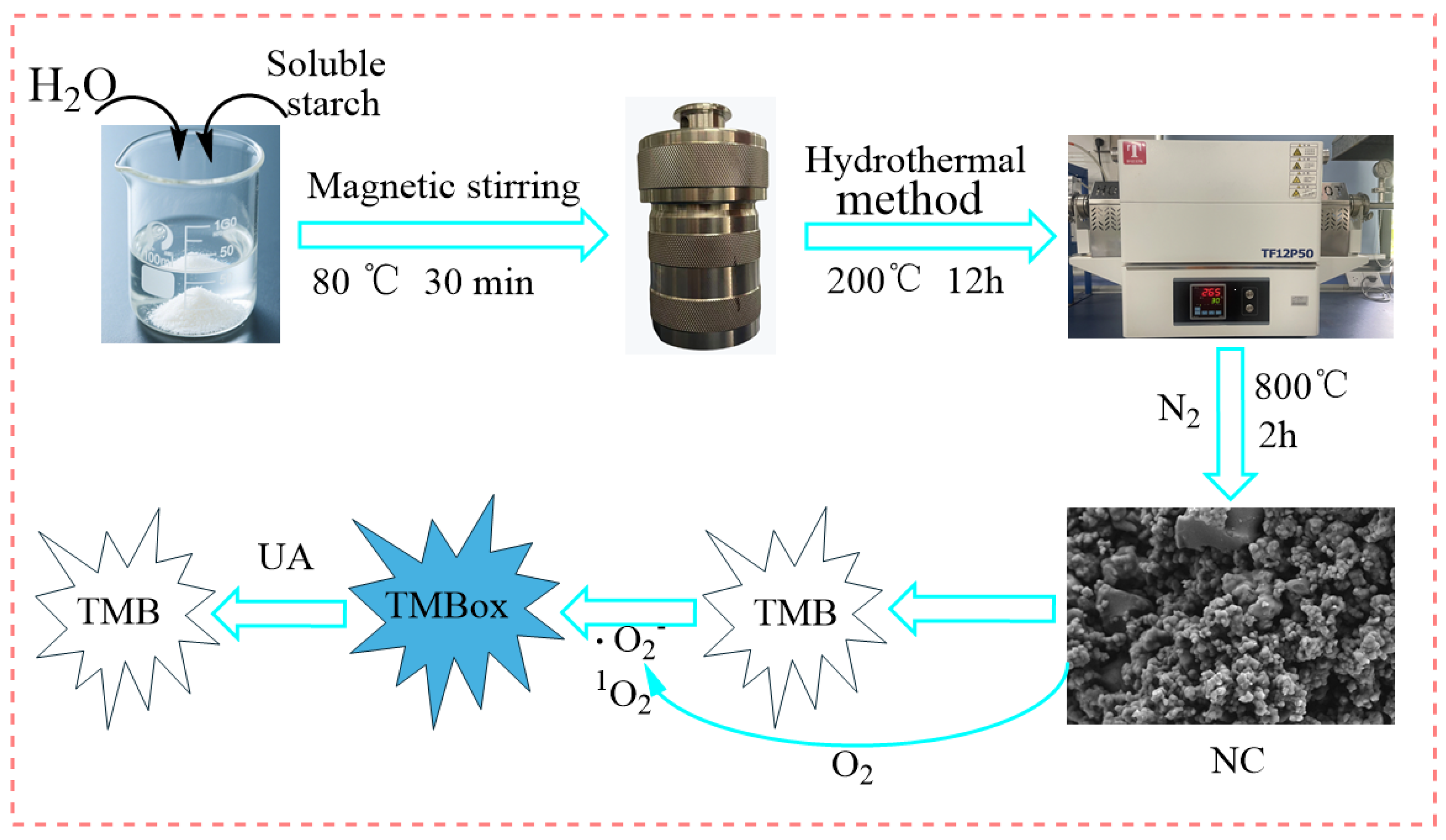 - Centrifuge tube d: 200 μL H2O2 (200 μmol·L−1), 60 μL TMB (8 mmol·L−1), 8 mg NC.