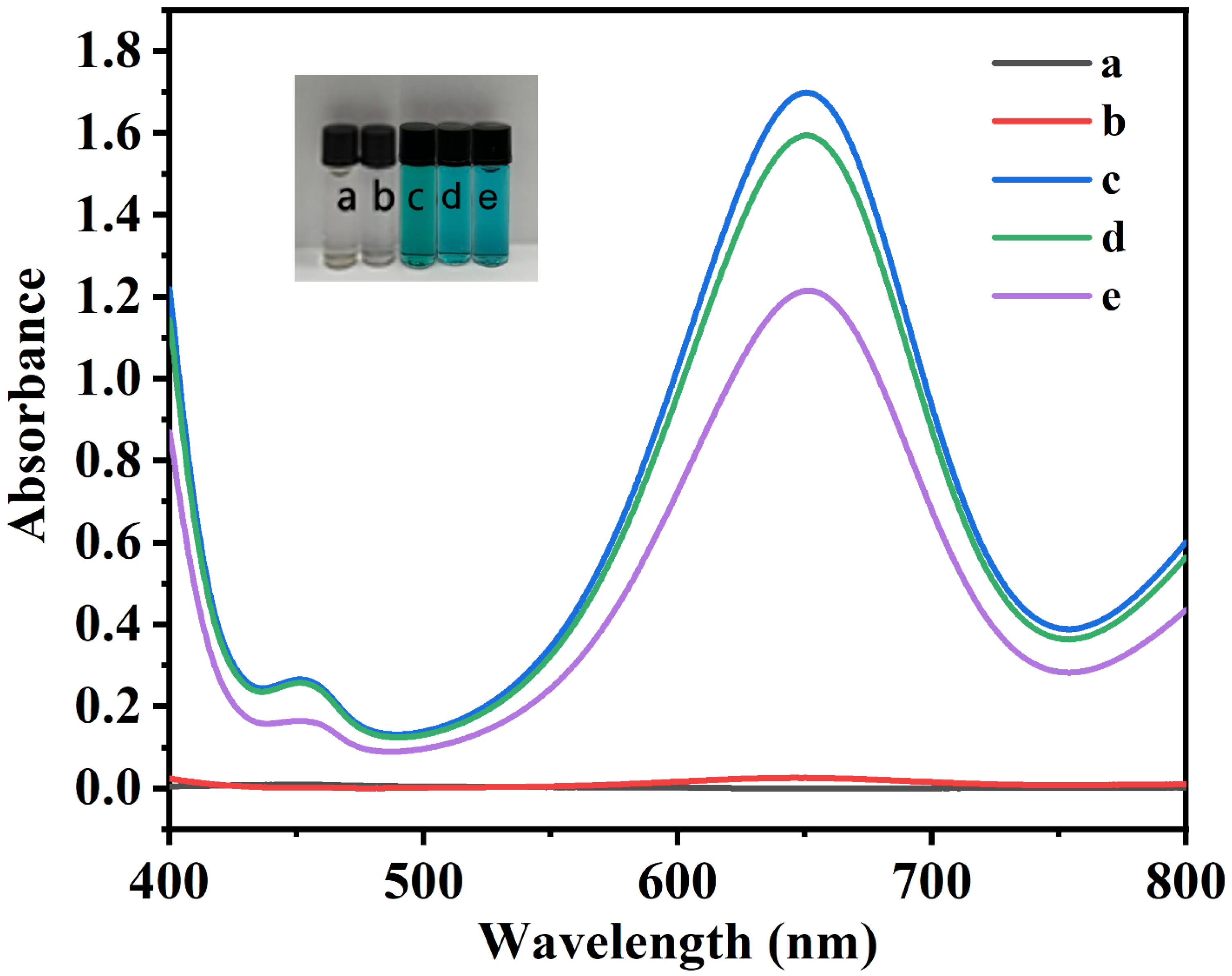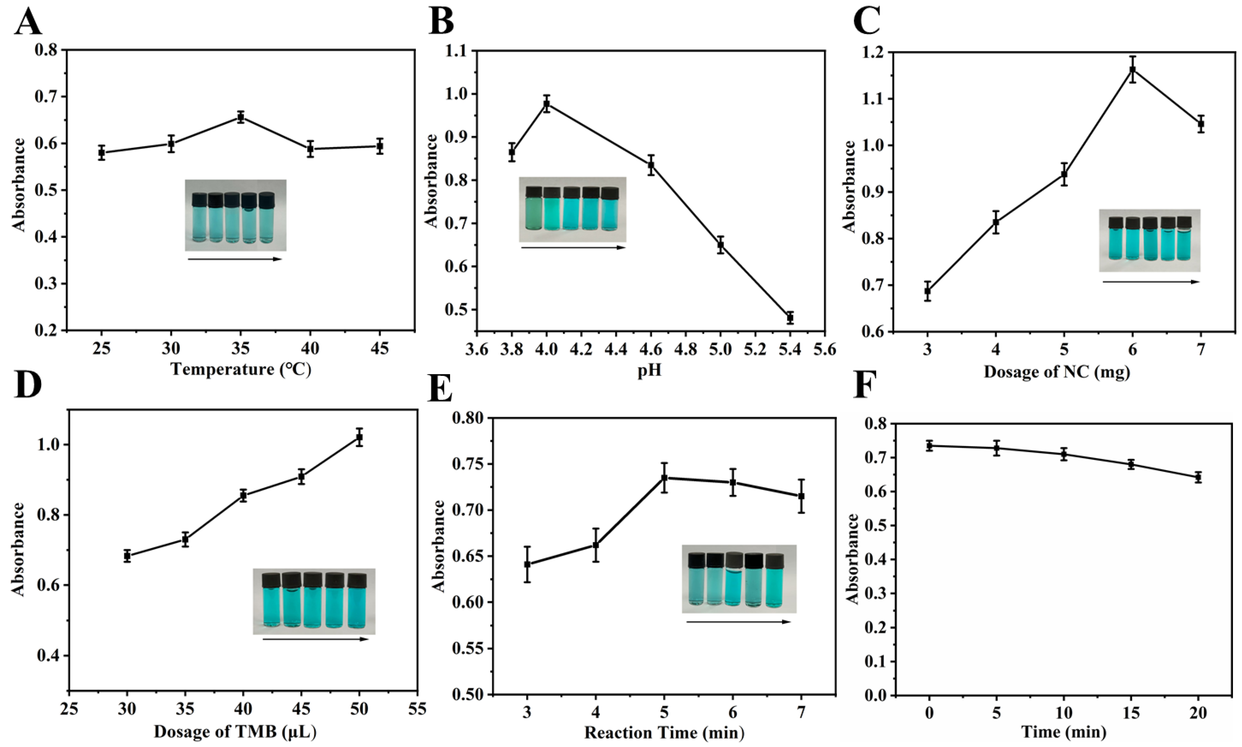 - The color of the solutions in both the TMB + NC (Figure 4(c)) and H2O2 + TMB + NC (Figure 4(d)) systems was blue, and the former has a slightly higher A652nm than the latter. This result demonstrates the ability of the TMB + NC system to achieve satisfactory color development in the absence of H2O2.