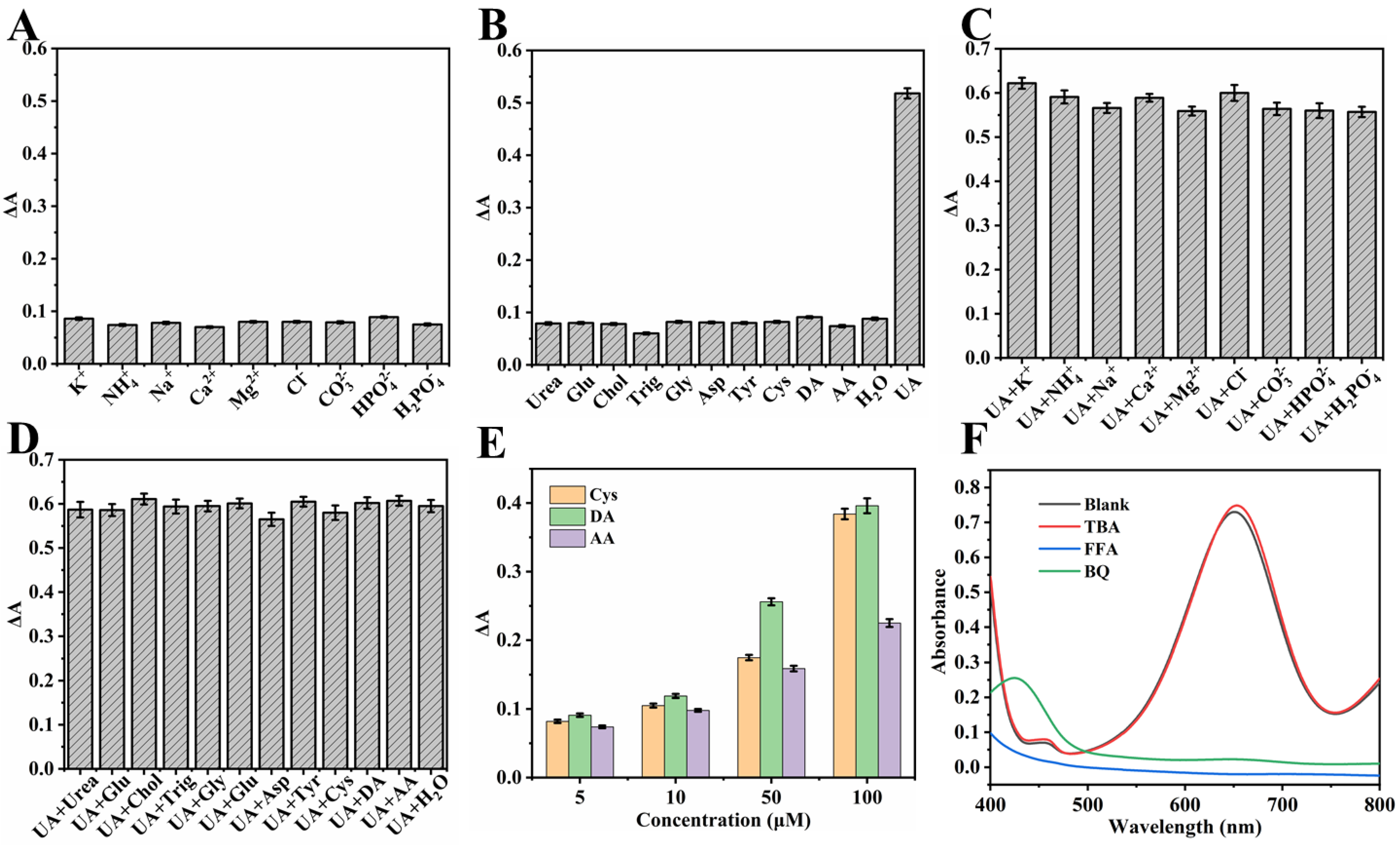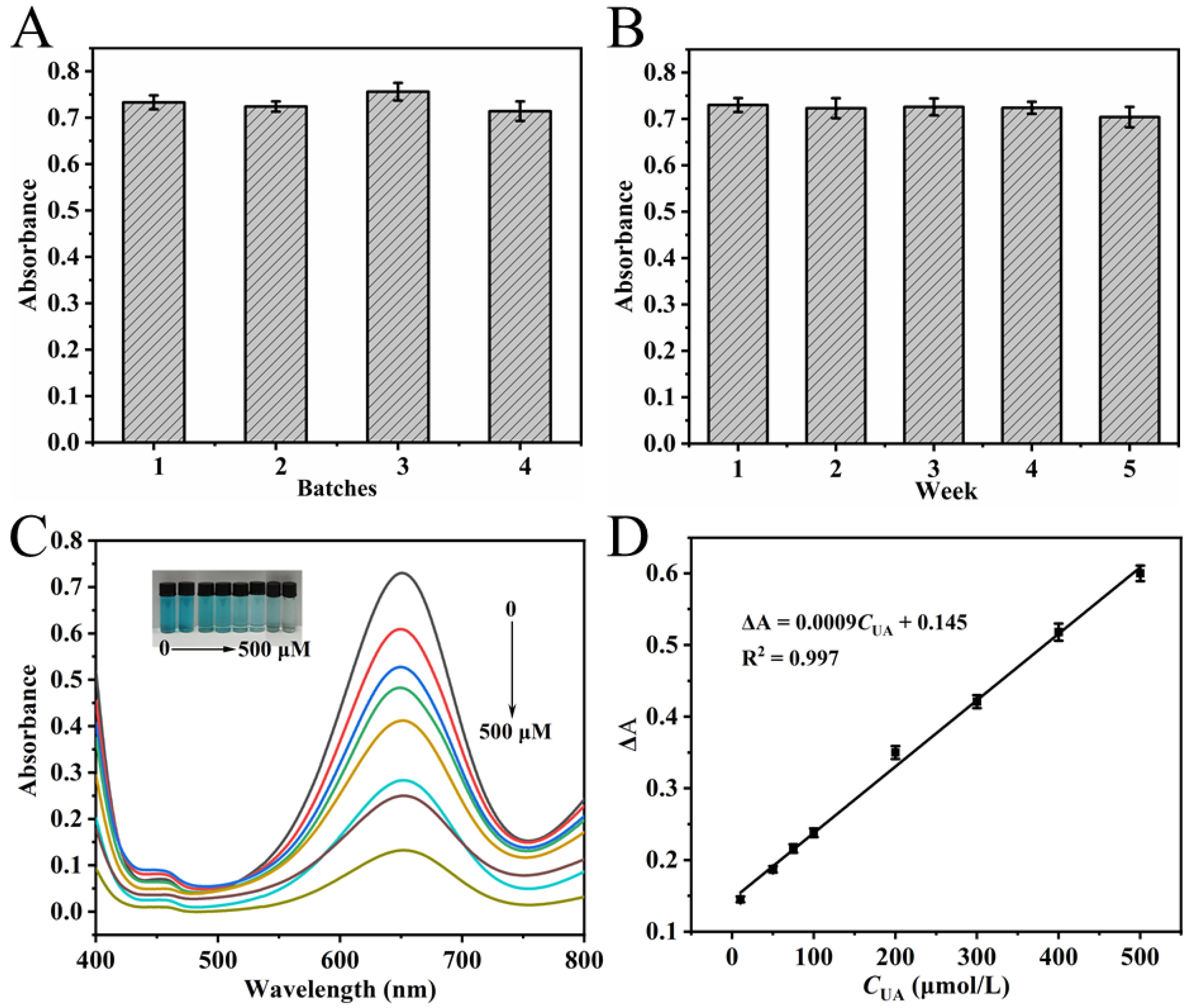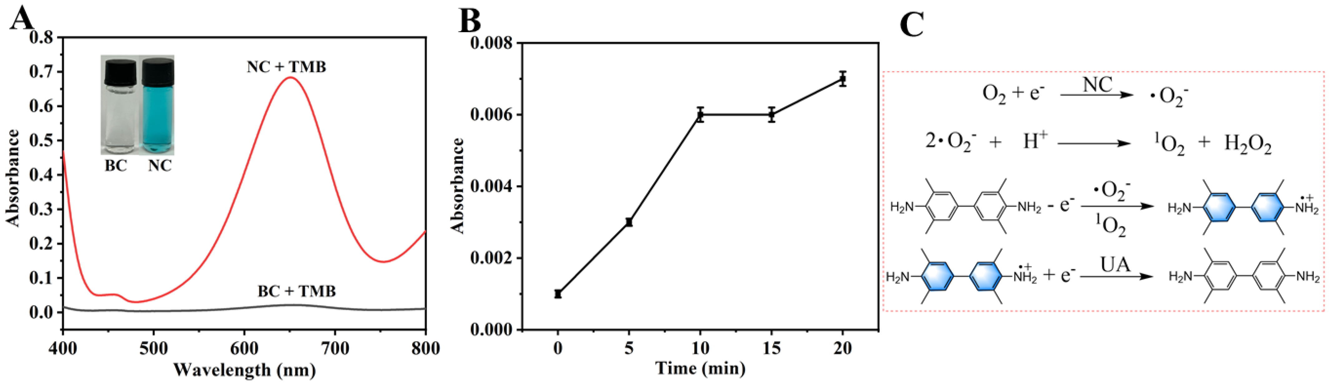 - The addition of UA to the filtrate of the TMB + NC system resulted in a significant decrease in A652nm (Figure 4(e)). This result indicates that UA can reduce the blue TMBox back to TMB, thereby confirming the feasibility of the colorimetric UA detection method based on the reduction in TMBox as monitored at 652 nm.