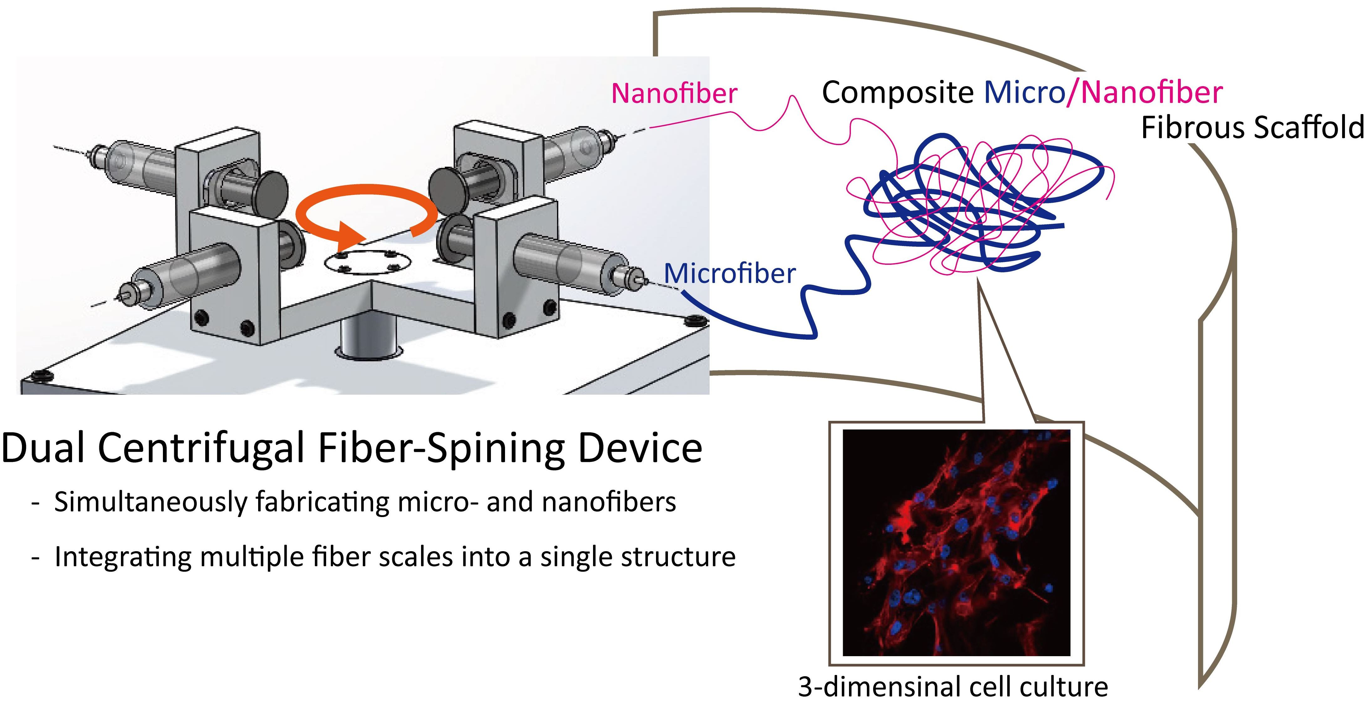 Centrifugal Fiber-Spinning Device Using Two Pairs of Counter-Facing Syringes for Fabricating Composite Micro/Nanofibers and Three-Dimensional Cell Culture
