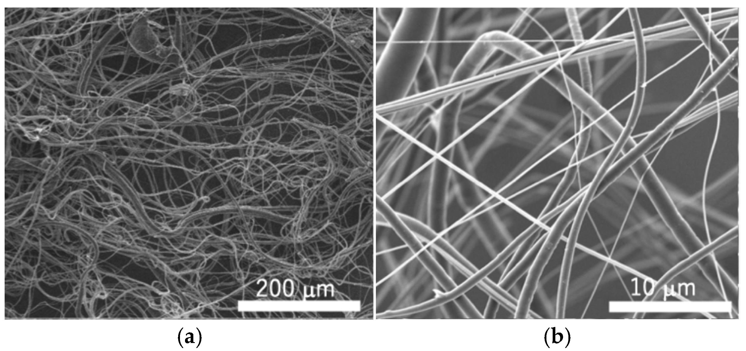 - Beachley, V.; Wen, X. Effect of electrospinning parameters on the nanofiber diameter and length. Mater. Sci. Eng. C Mater. Biol. Appl. 2009, 29, 663–668. [Google Scholar] [CrossRef]