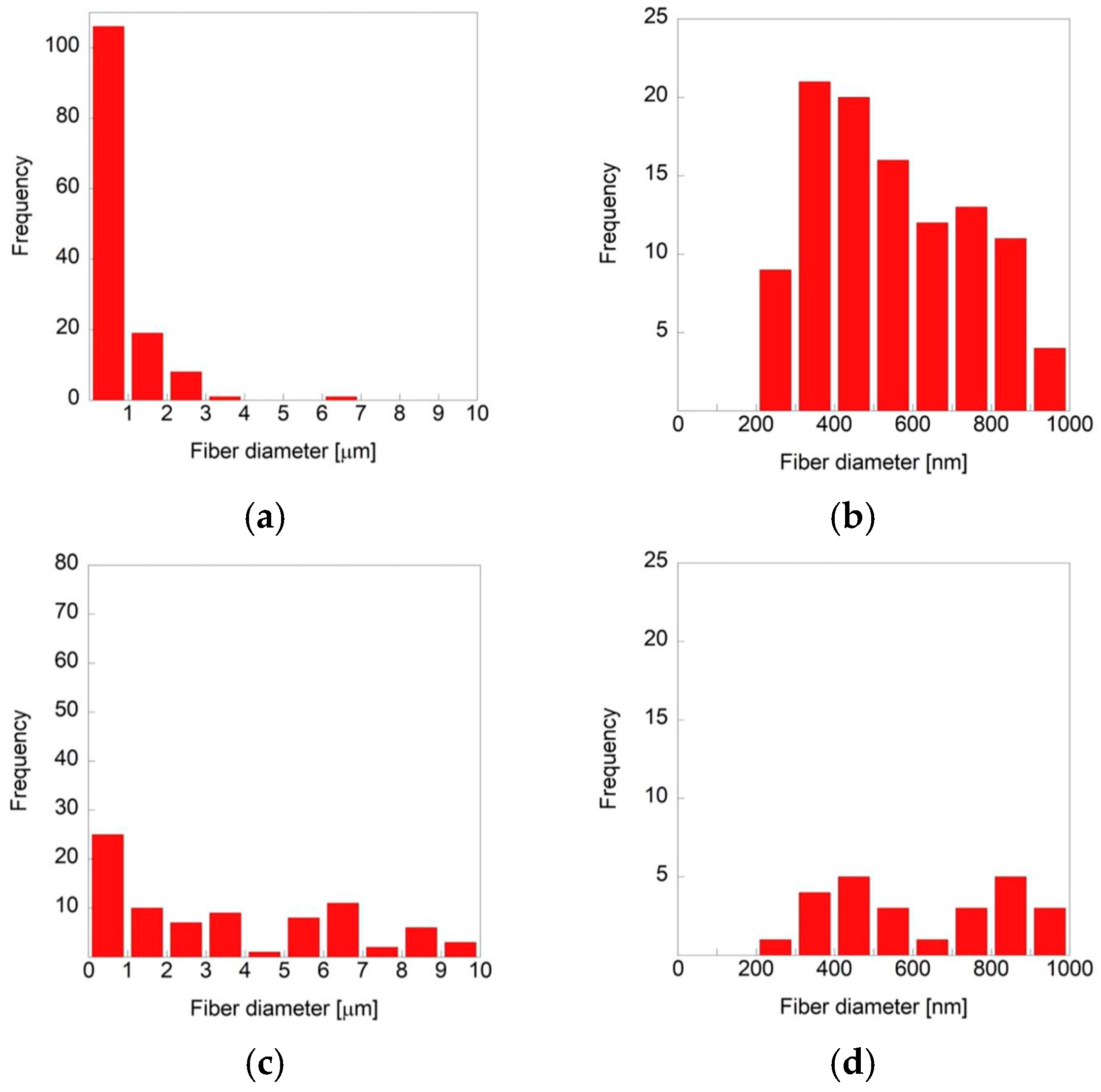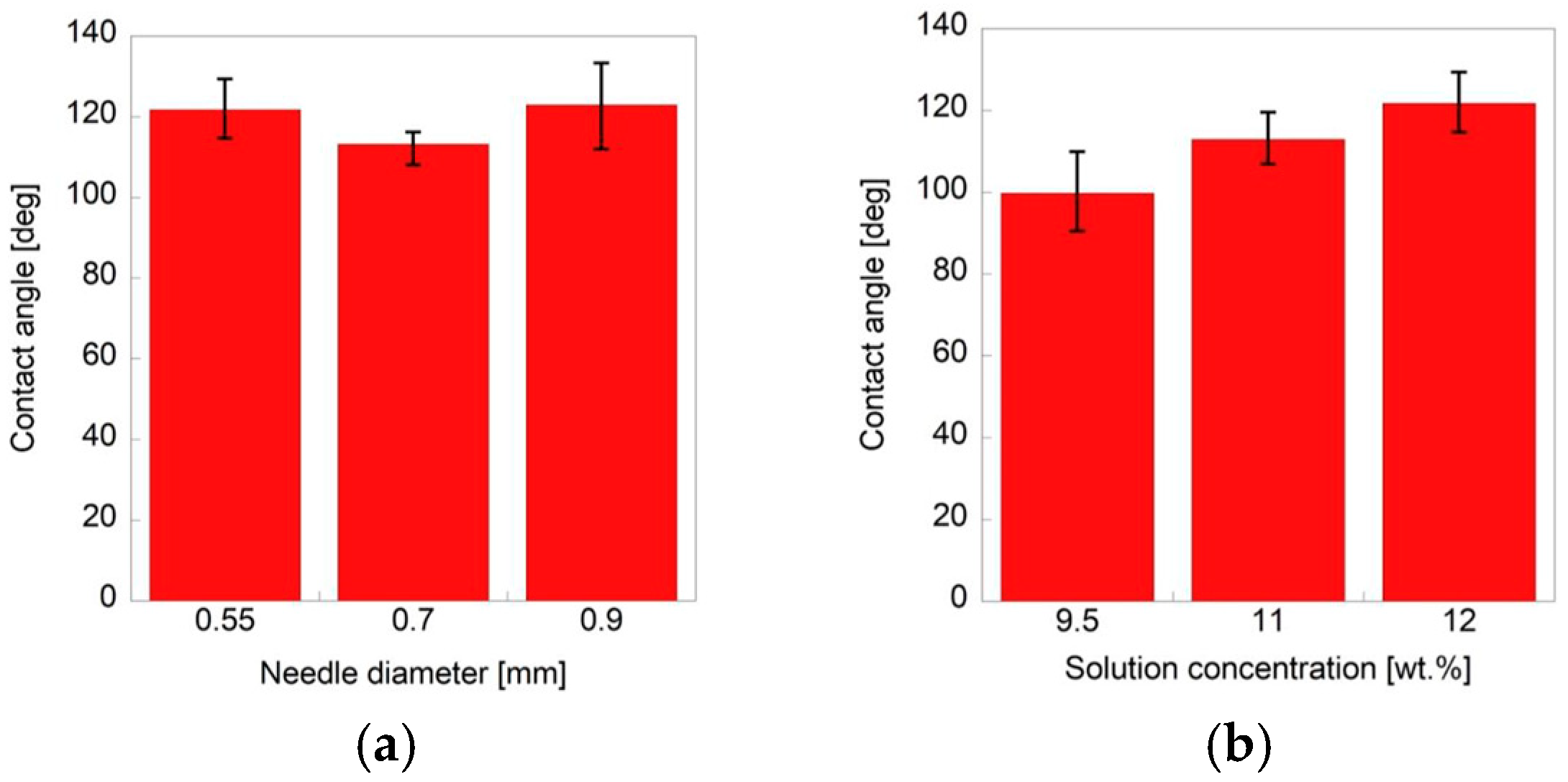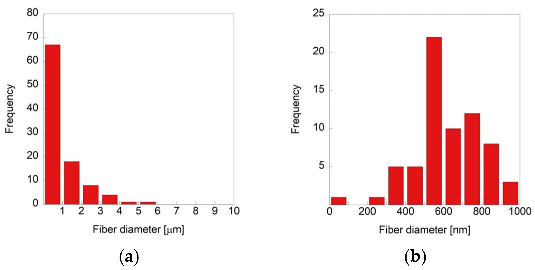 3.1. Diameter Distribution, Porosity, and Wettability of Single-Mode Micro- and Nanofibers