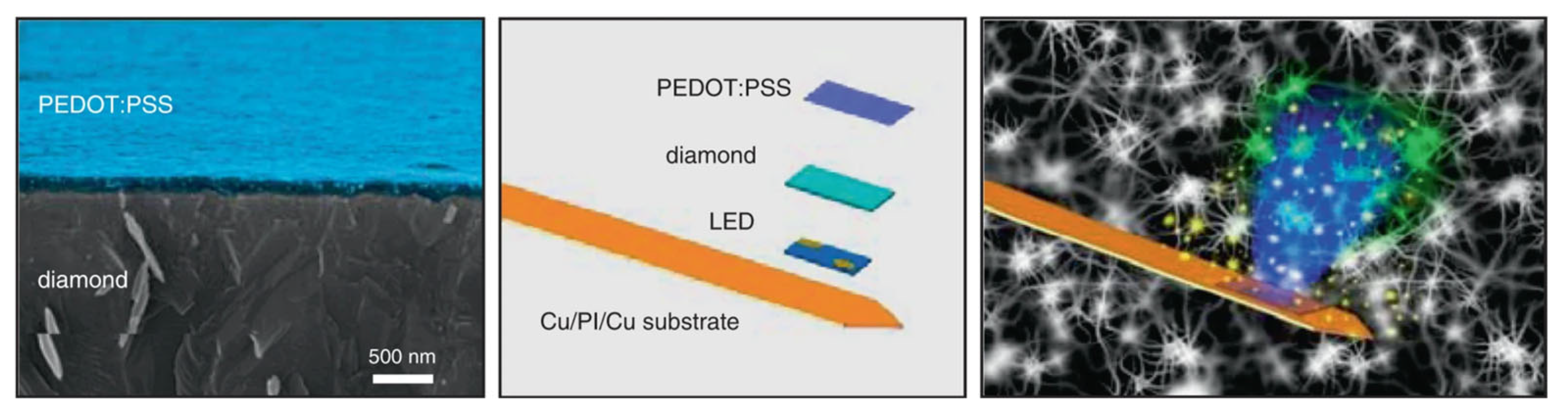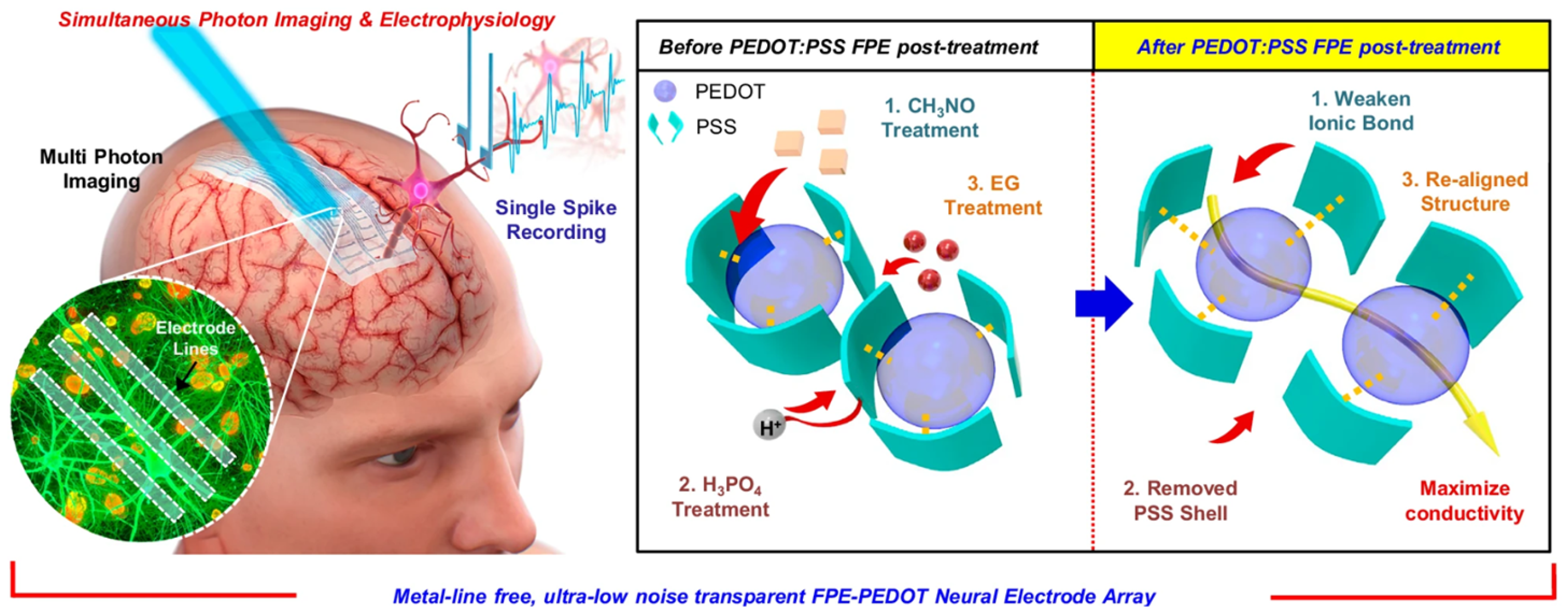 - Kim, H.W.; Kim, J.; Kim, J.Y.; Kim, K.; Lee, J.Y.; Kim, T.; Cho, S.; An, J.B.; Kim, H.J.; Sun, L.; et al. Transparent, metal-free PEDOT:PSS neural interfaces for simultaneous recording of low-noise electrophysiology and artifact-free two-photon imaging. Nat. Commun. 2025, 16, 4032. [Google Scholar] [CrossRef] [PubMed]