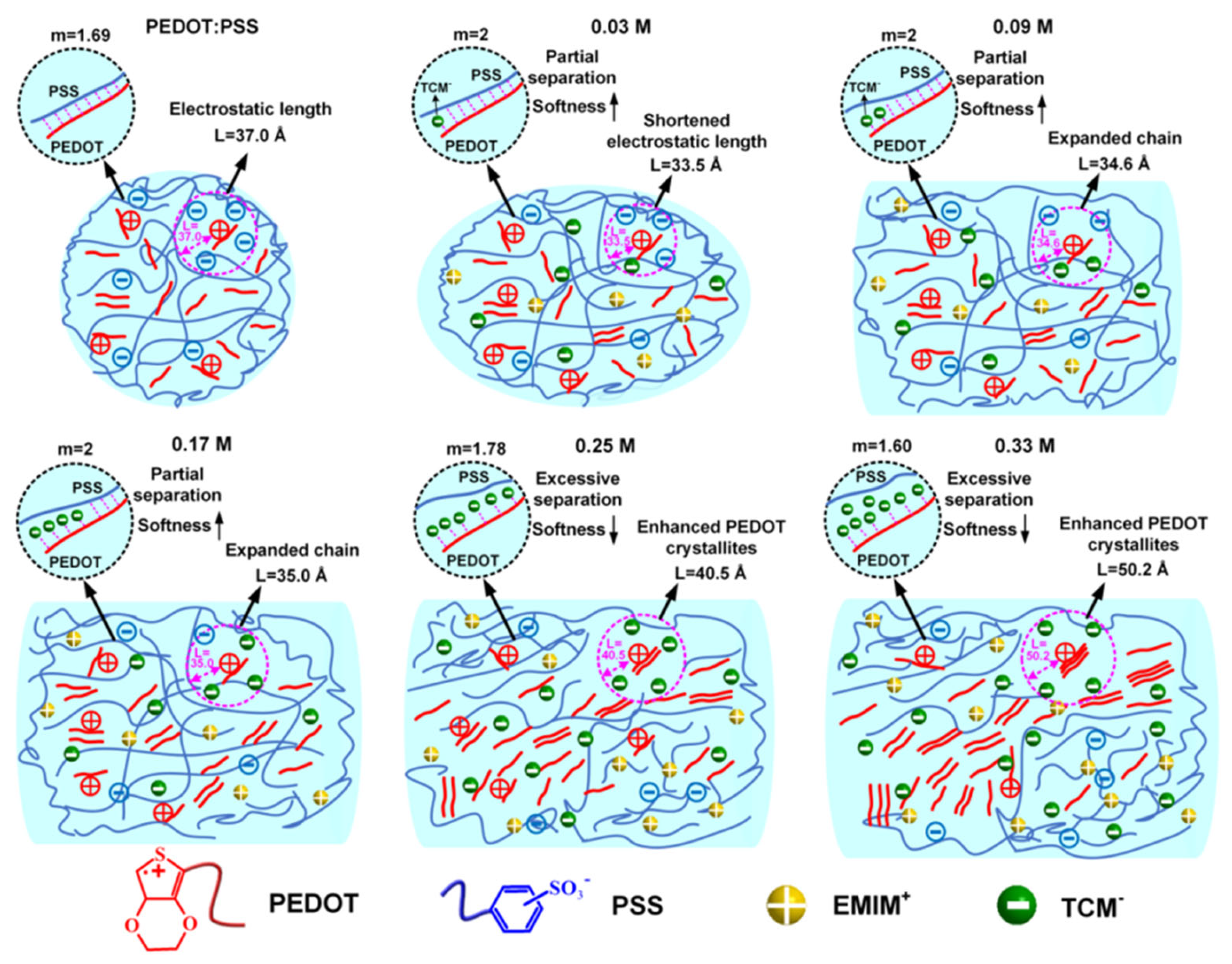 - Liu, Z.; Li, X.; Zou, R.; Zhou, Z.; Ma, Q.; Zhang, P. Deciphering the quaternary structure of PEDOT:PSS aqueous dispersion with small-angle scattering. Polymer 2022, 261, 125415. [Google Scholar] [CrossRef]