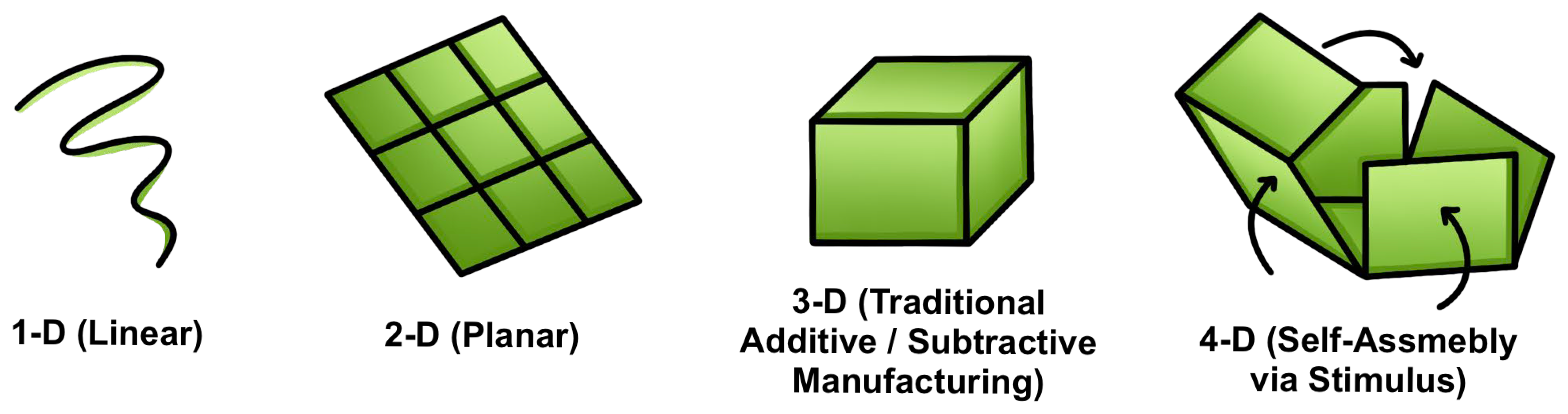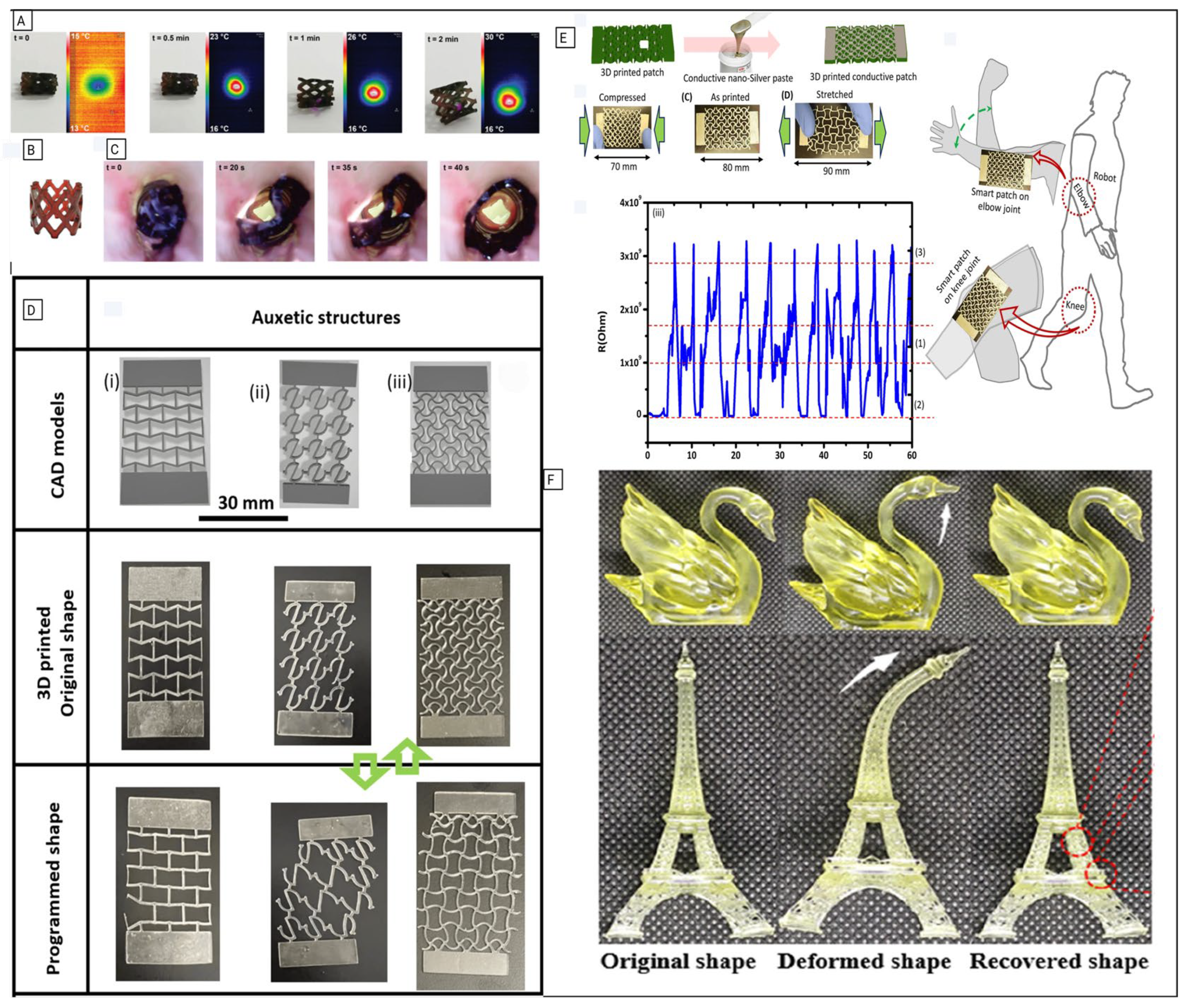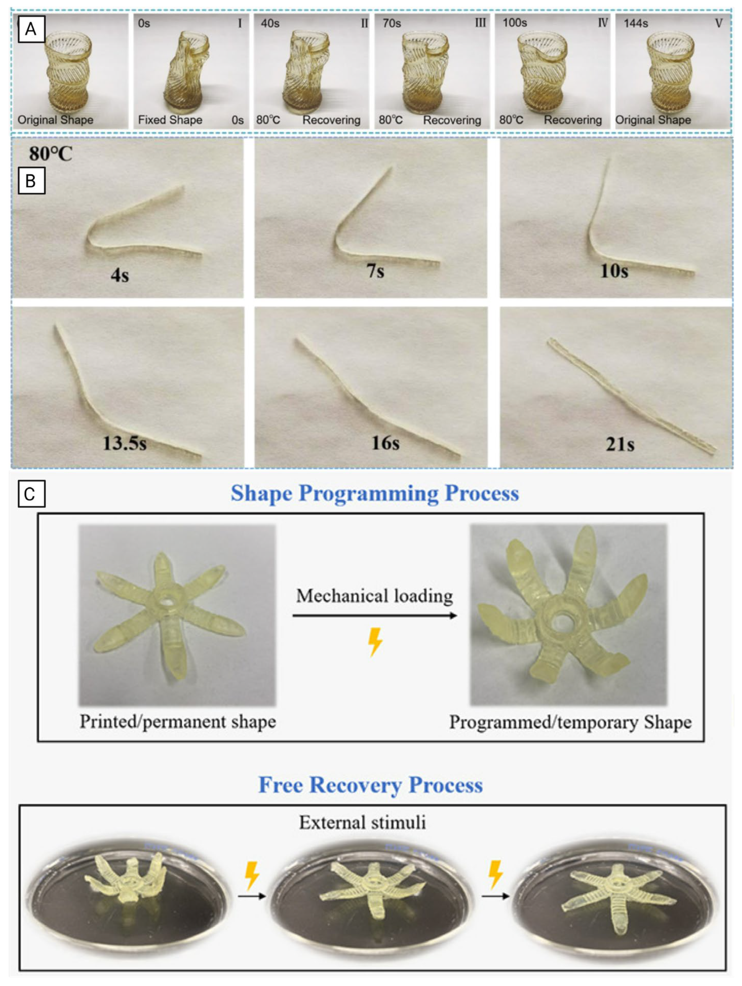 | Definition | Additive manufacturing of SMP-based static implantable biomedical devices | Additively manufactured implantable devices made of SMPs that dynamically change shape over time inside the body post-implantation in response to an external stimulus | [195] |
