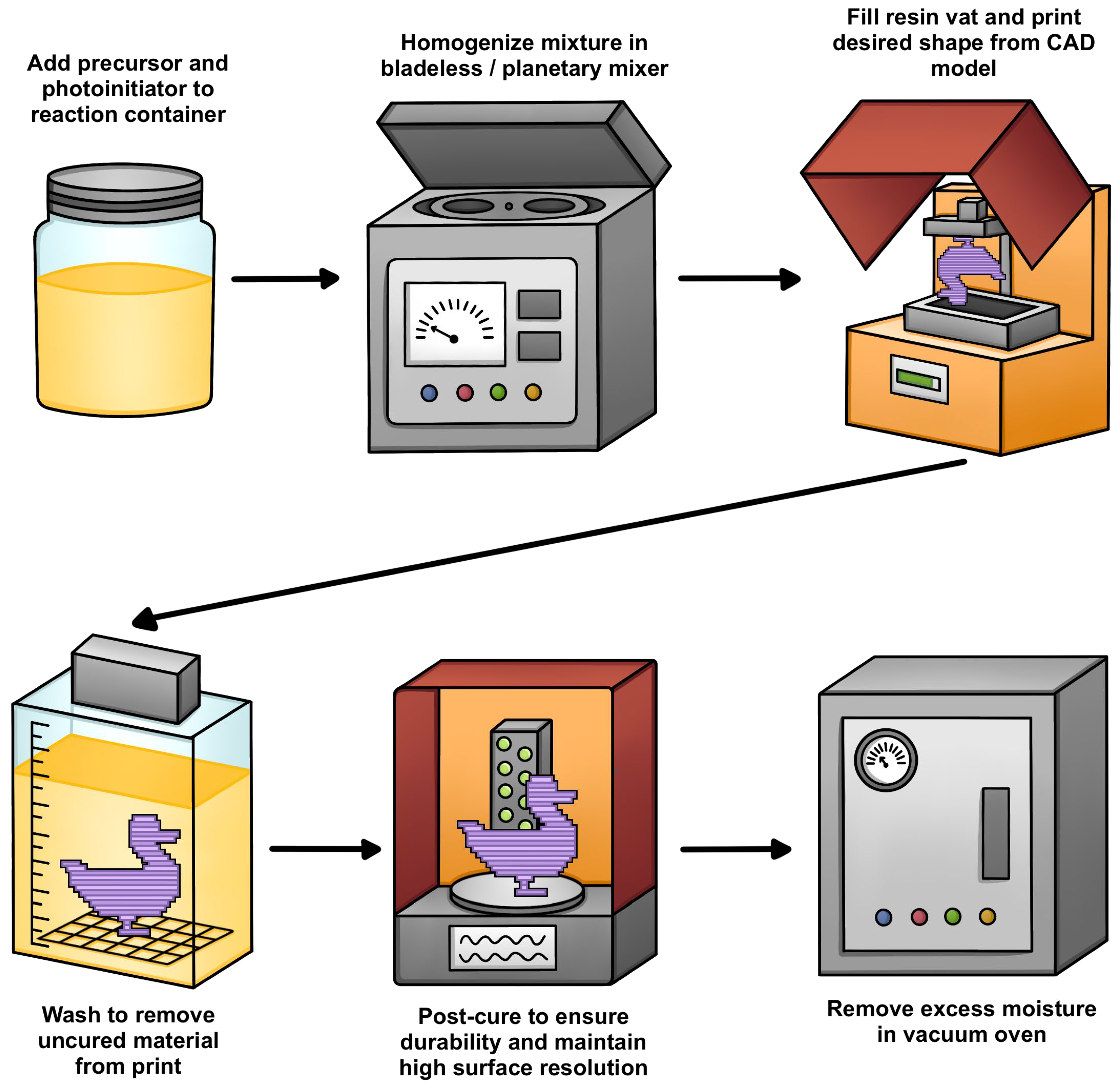 | Post-Processing | Requires extensive UV or thermal post-curing and solvent washing to remove uncured resin | Often requires minimal or no curing; washing steps to remove residual resin | SLA-printed SMPs need further curing steps to maintain properties | [58] |