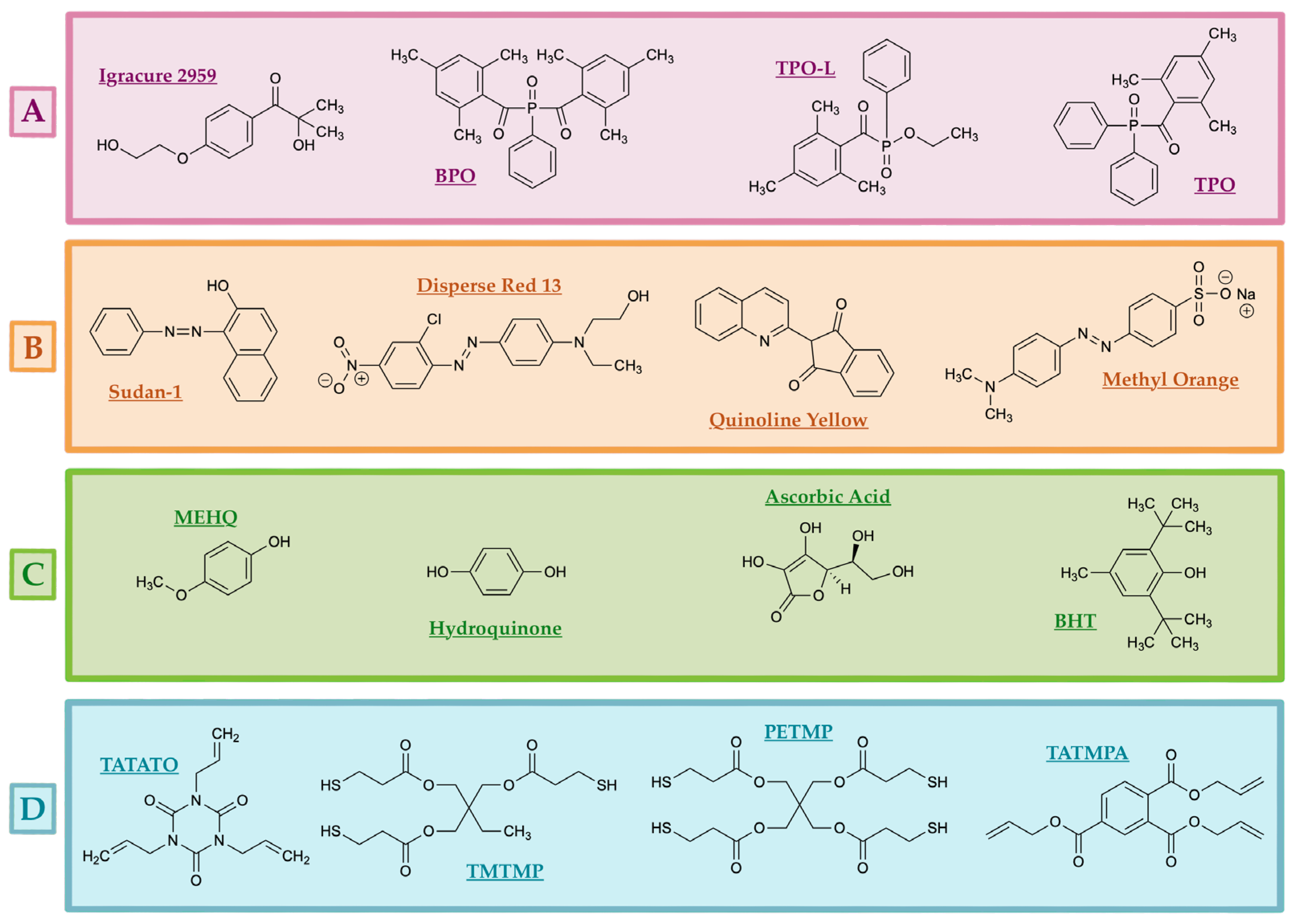 - Dzwonkowska-Zarzycka, M.; Sionkowska, A. Photoinitiators for Medical Applications—The Latest Advances. Molecules 2024, 29, 3898. [Google Scholar] [CrossRef] [PubMed]