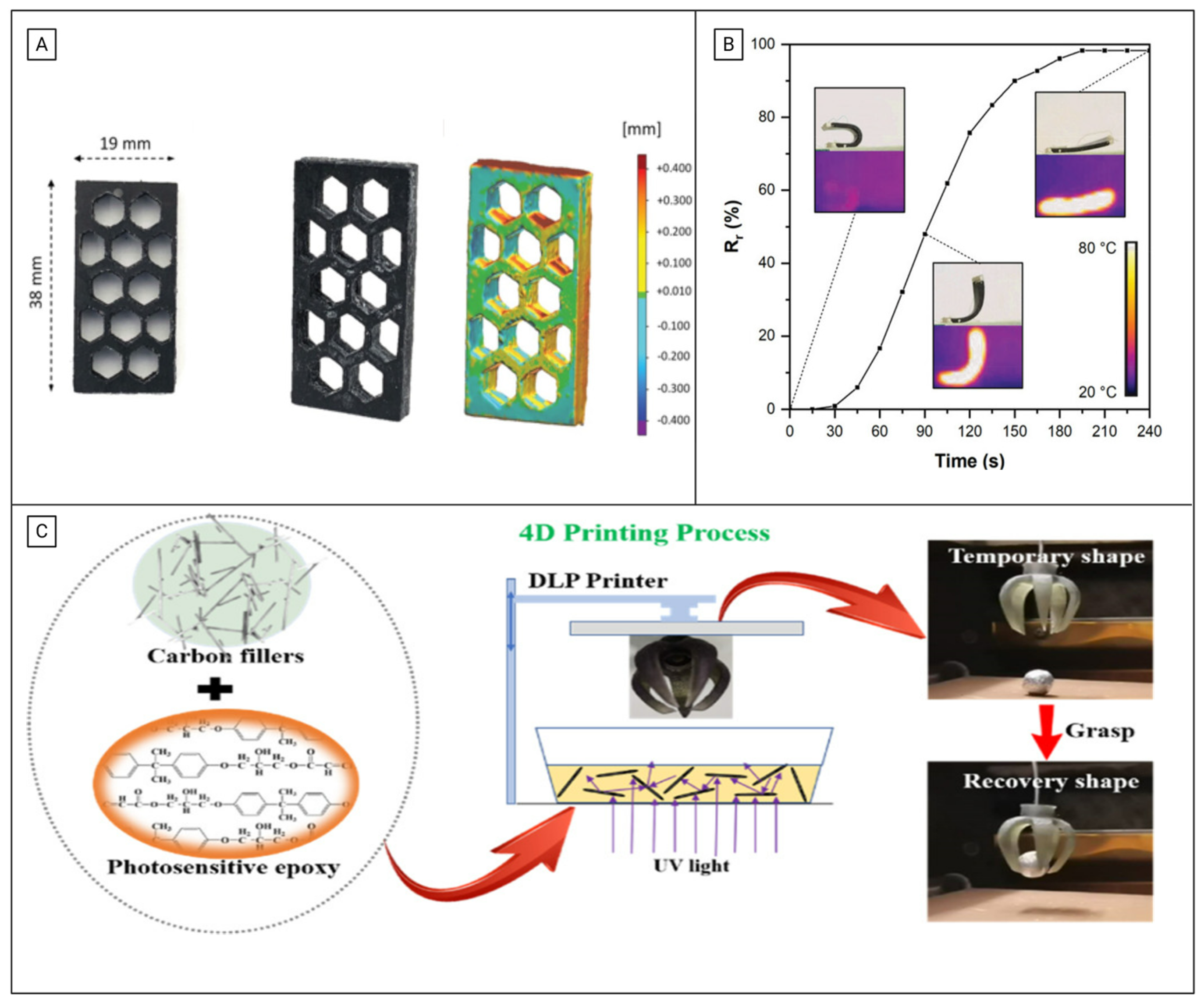 | Cyanate-ester-based SMP IPNs and composites (e.g., triple-shape CE networks) | DLP | Tg > 160; processing- dependent | Triple-shape Rf high | High heat distortion; low dielectric; robust | Limited; suitable composites | [71,72] |